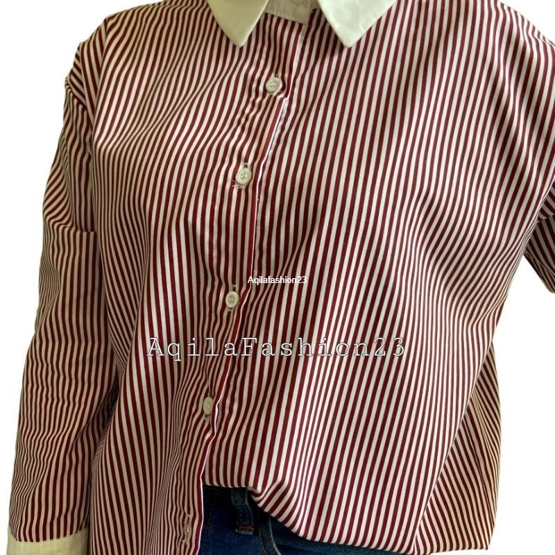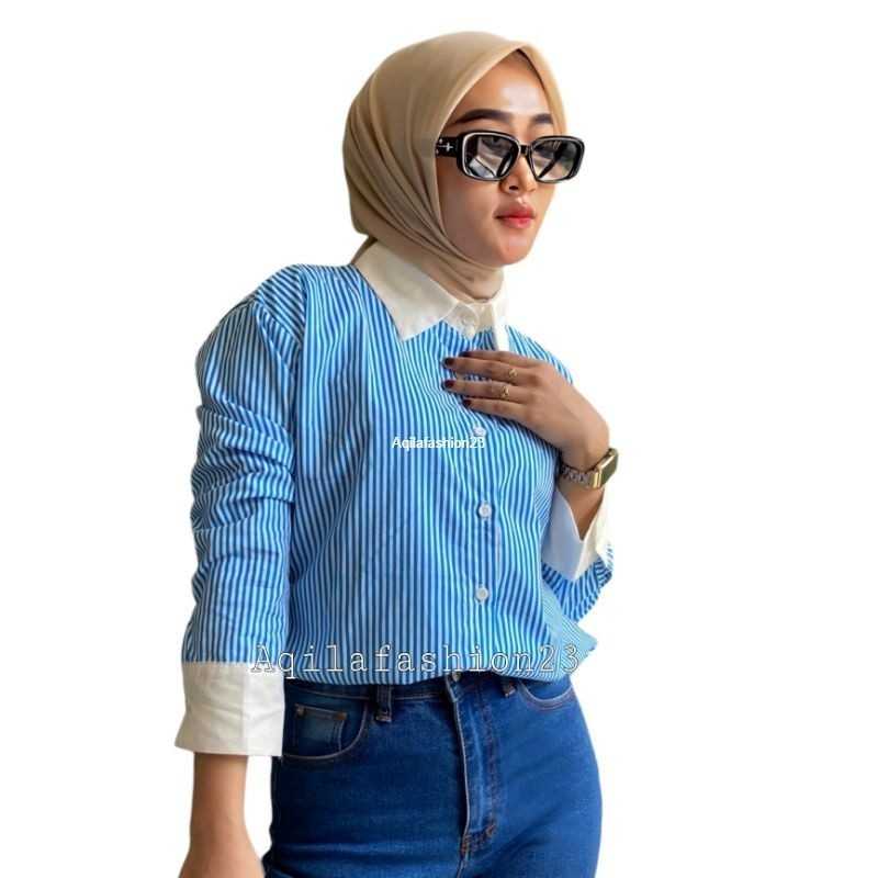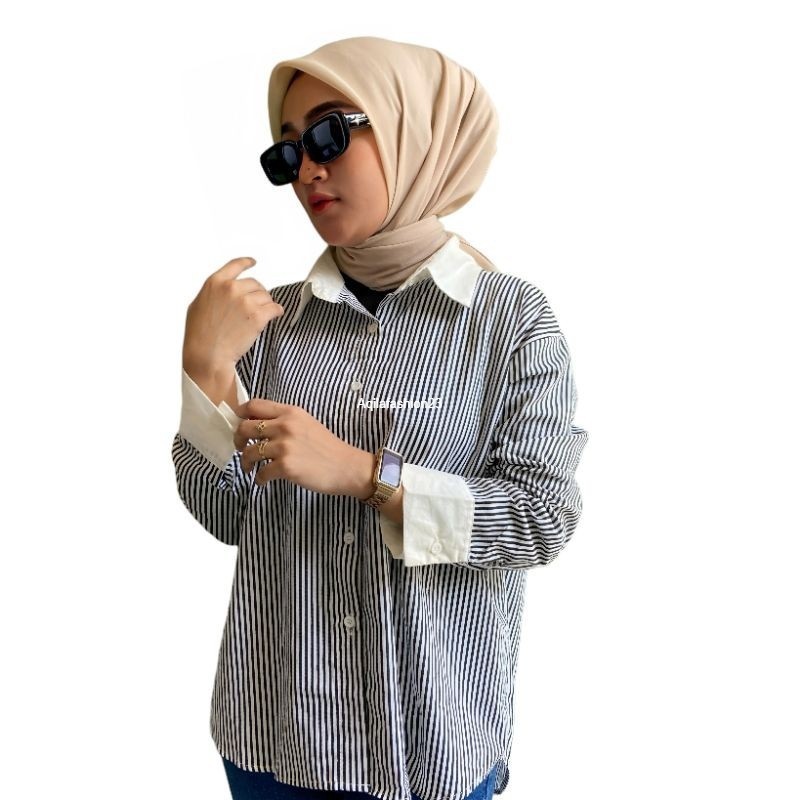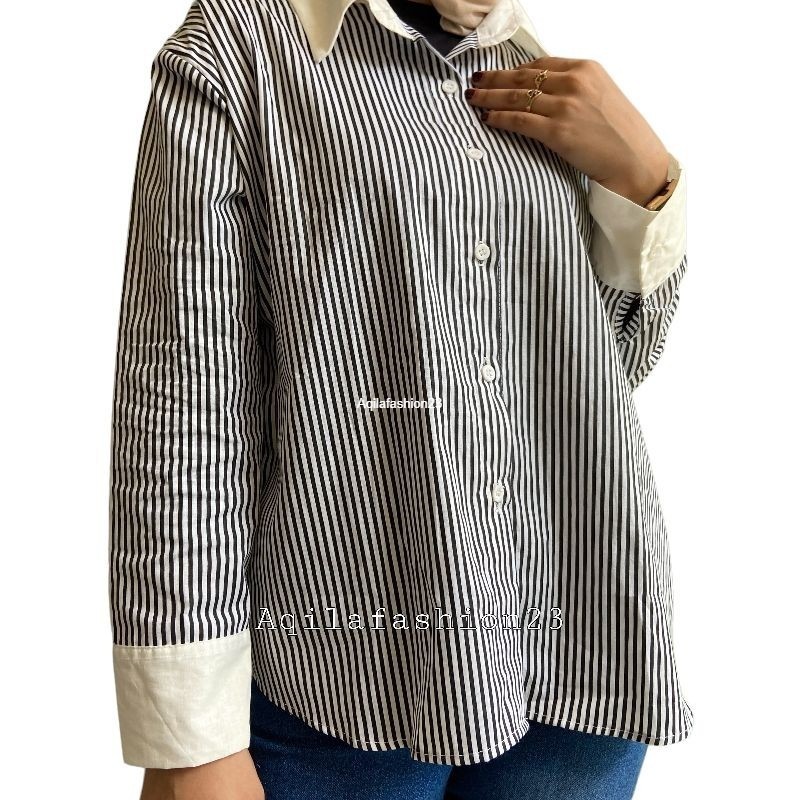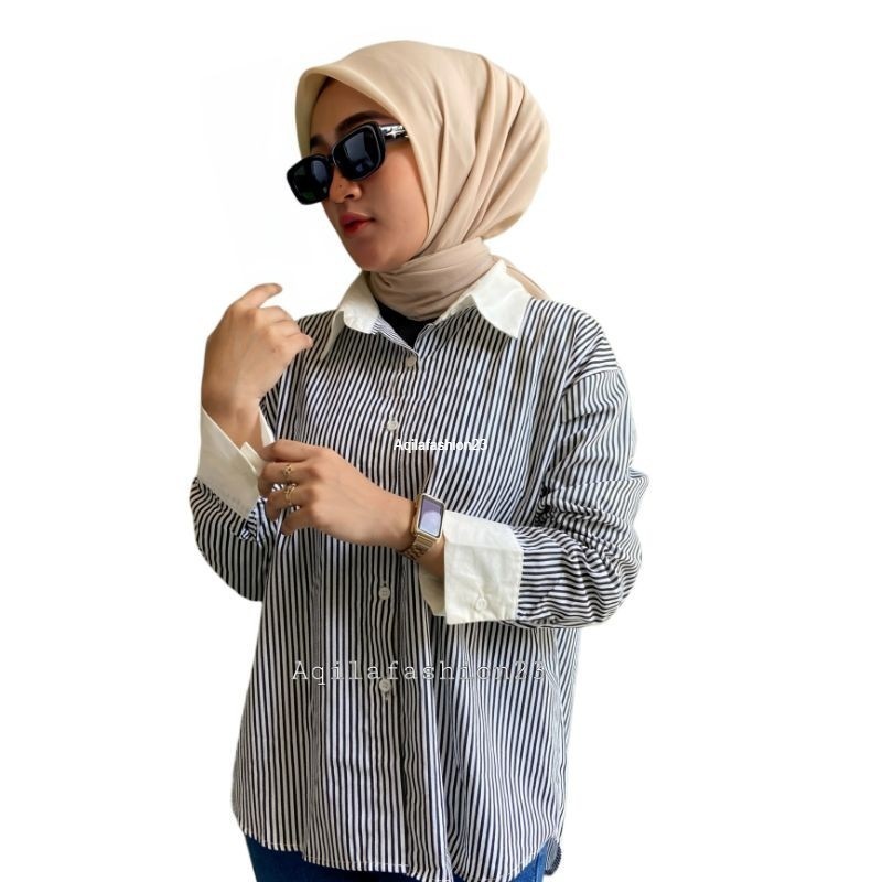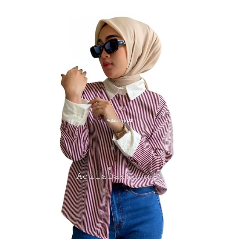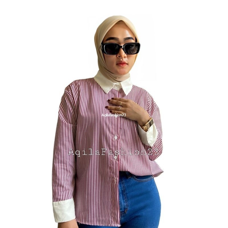 Atasan kemeja wanita stripe kekinian terbaru lengan panjang all size Nori Shirt by Aqila Fashion