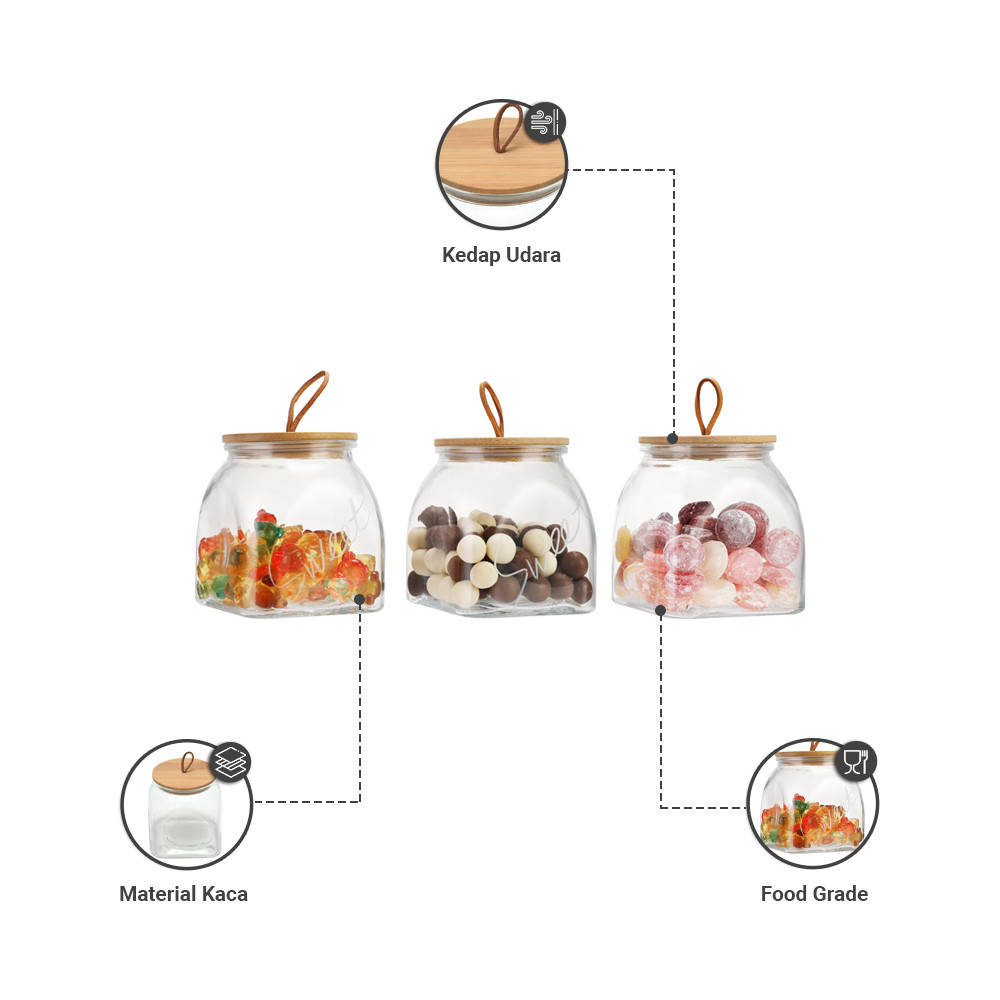 Informa Set 3 pcs Wiley Stoples Kaca Jar Tempat Simpan Snack Dan Permen Setoples Toples Serbaguna Perlengkapan Dapur Wadah Cemilan Wadah Permen Tempat Bumbu Dapur Kontainer Kue