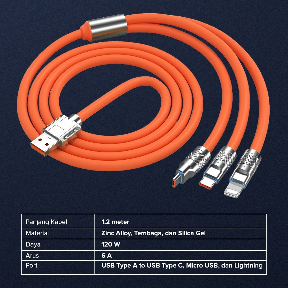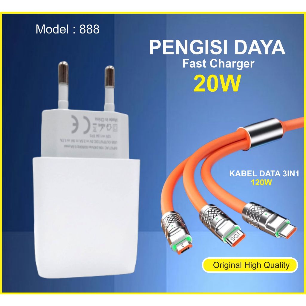 Charger Model 888 + Kabel Data 120W Fast Charging 3in1 (Micro, Type C, Lightning) Pengisian Daya Cepat 6A Super Quick Charging