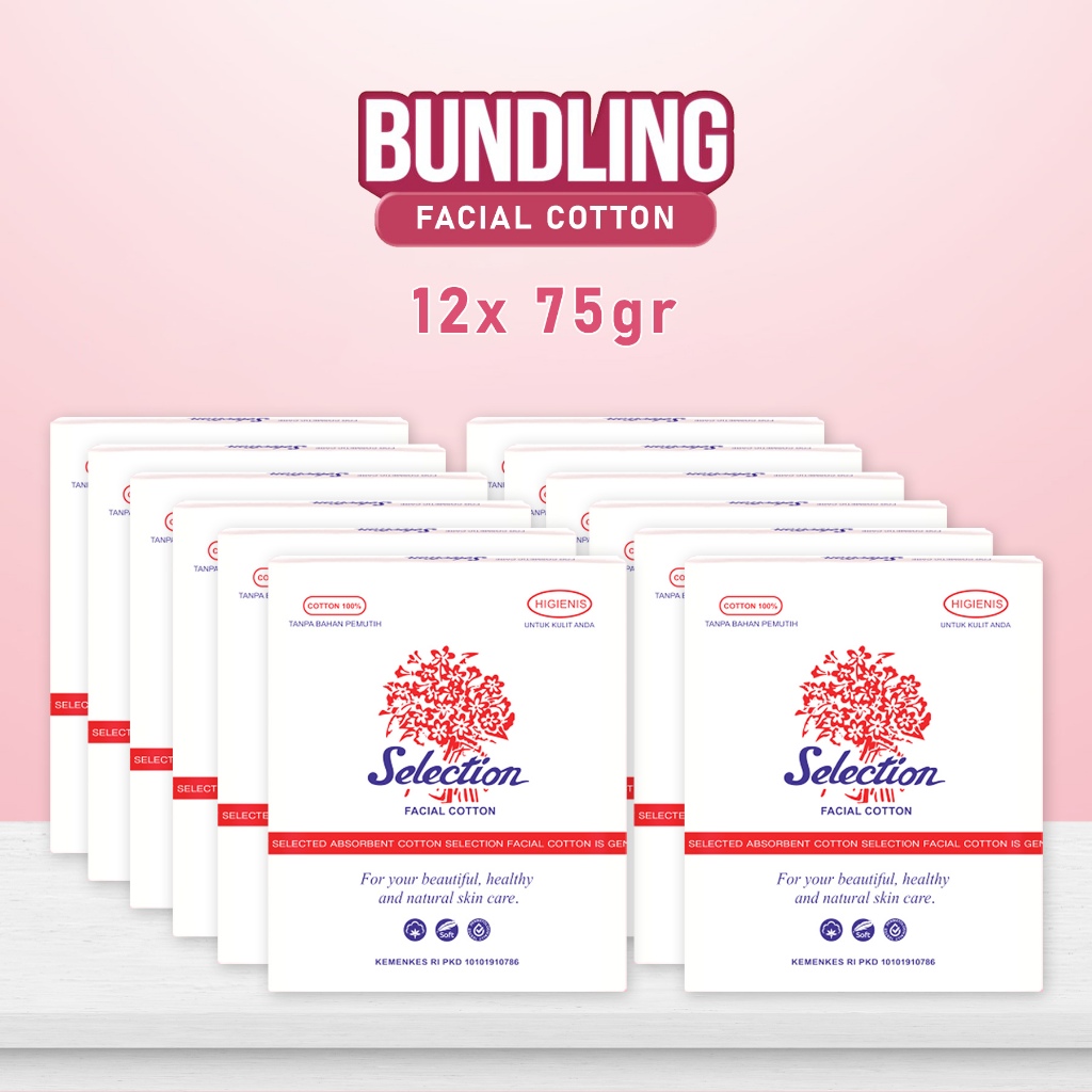 Paket Reseller !! Kapas Wajah SELECTION 100% Cotton Higienis 75gr x12 Pcs Tanpa Pemutih Jumbo Non Mercury Perawatan Skincare Sehari-hari