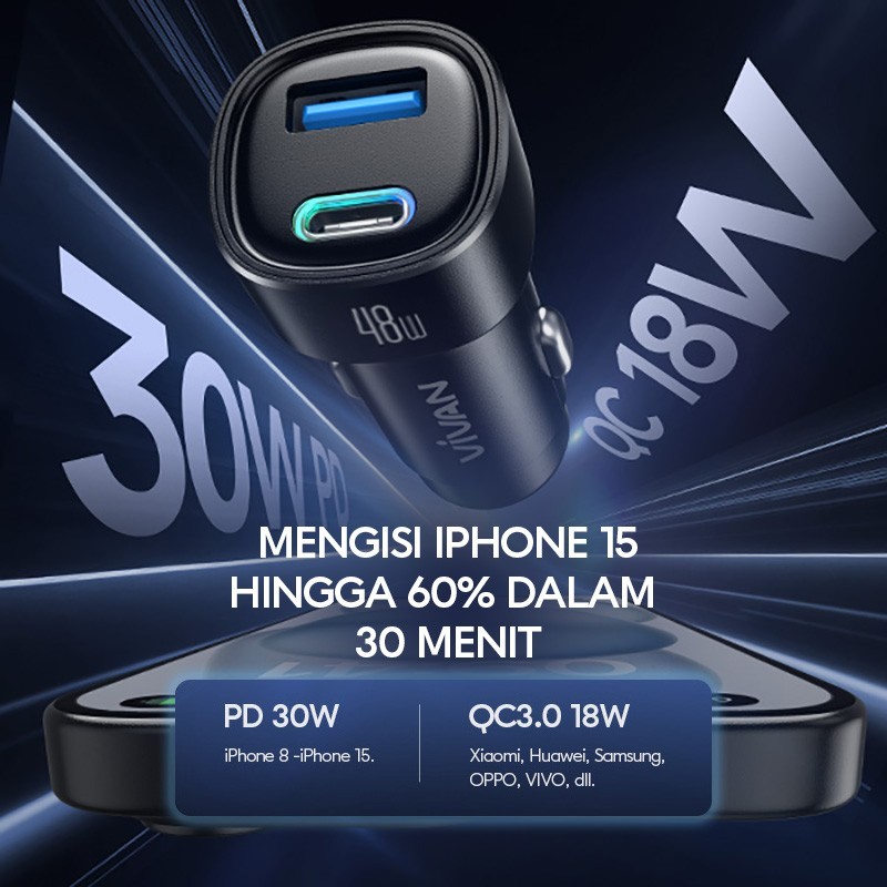 VIVAN VCC07 Car Charger 2 Ports USB & TypeC 48W 3A PD QC 3.0 Fast Charging LED
