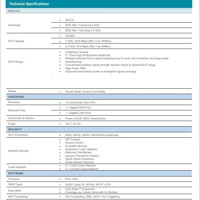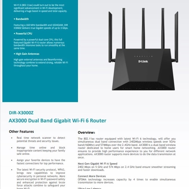 Router DLINK D-Link DIR-X3000Z EXO AX3000 Wi-Fi-6 Smart Router 5 High Gain Antenna Gigabit