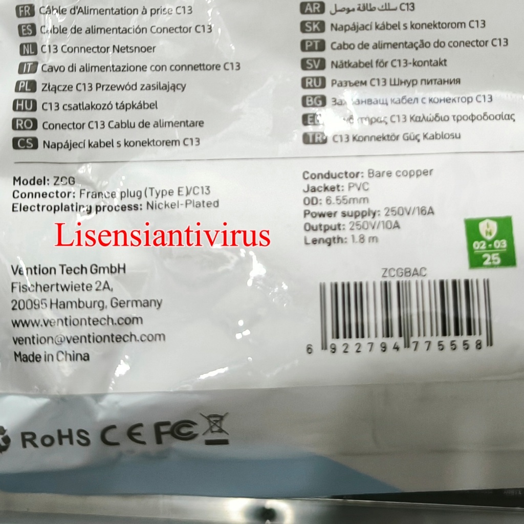 Vention Kabel Power CPU C13 Connector 3-Prong CPU PC Komputer UPS ZCG 1.8 Meter
