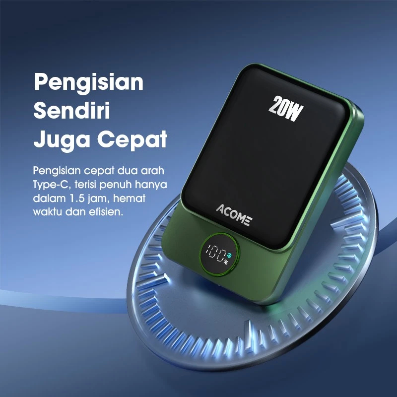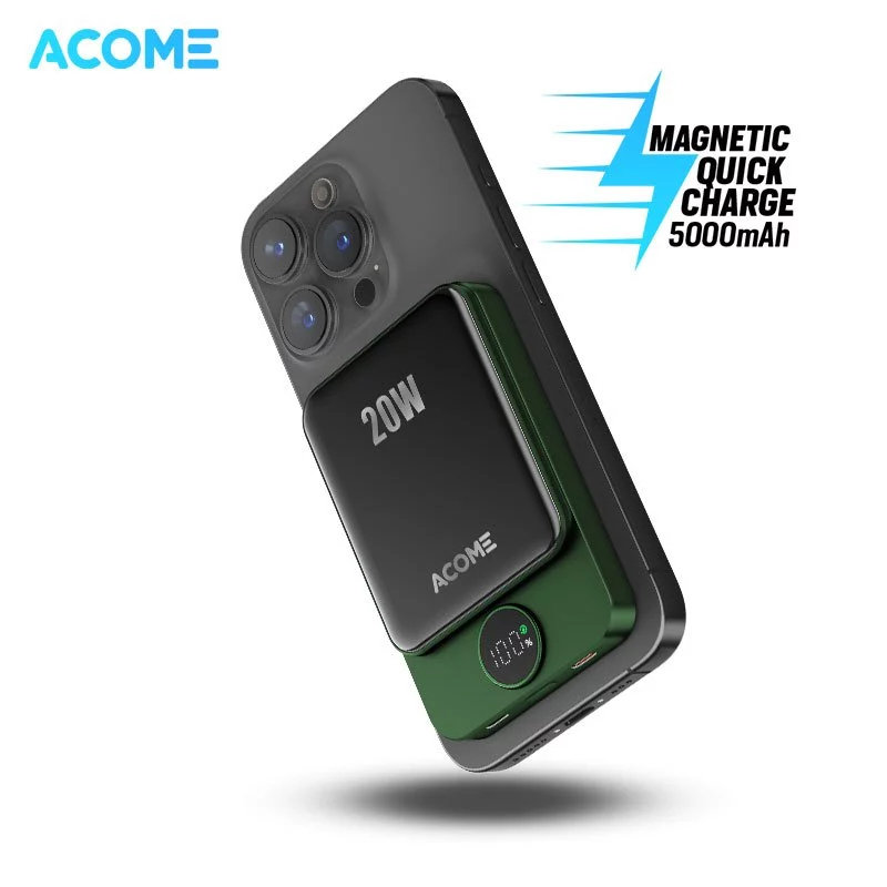 ACOME Powerbank Wireless AP050 Magnetik 5000mAH Magsafe 20W Fast Charging Type-C Lightning Green Garansi Resmi 1 Tahun