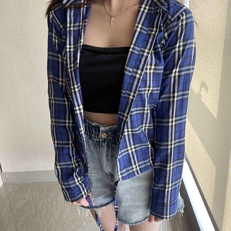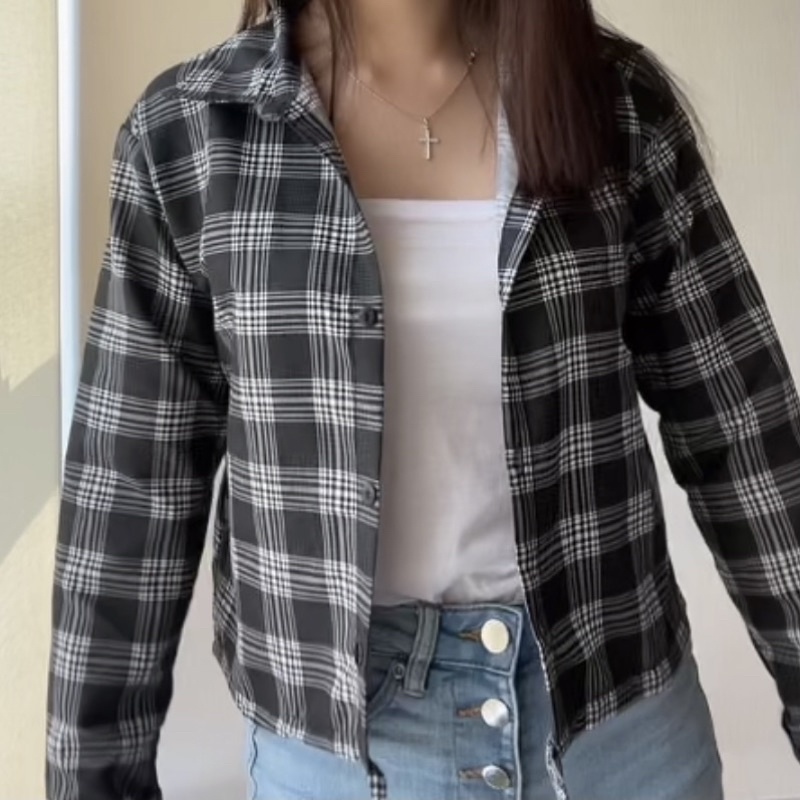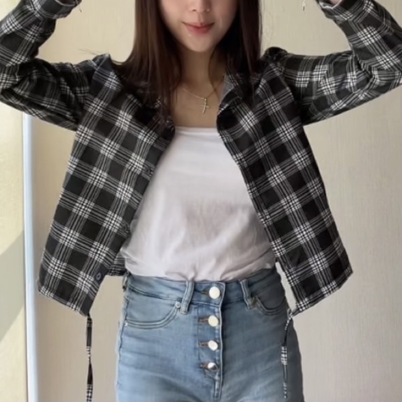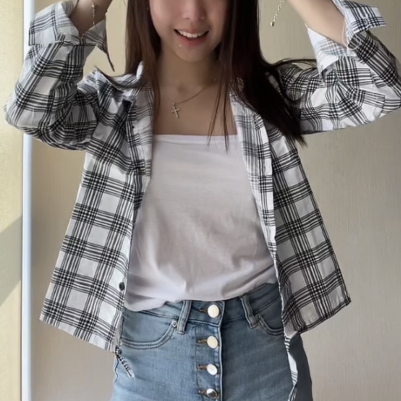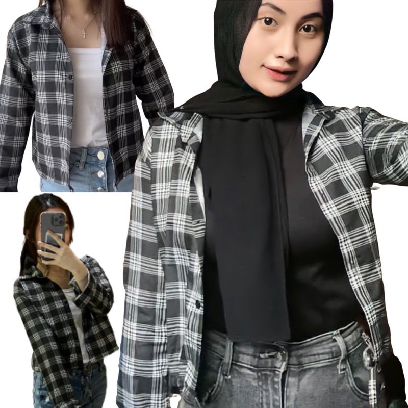 Kemeja Wanita Casual Blouse Kameja Oversize Wanita Lengan Panjang Baju Fashion Mulim Korea Style Kemeja Korea Outer Lengan Panjang Bts Park Jimin Kotak-Kotak Crop Viral Import Koreanstyle
