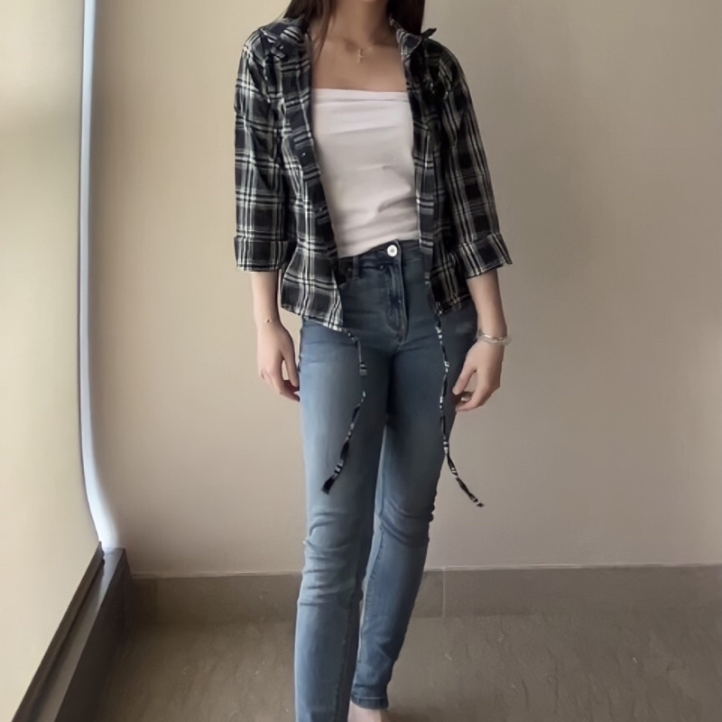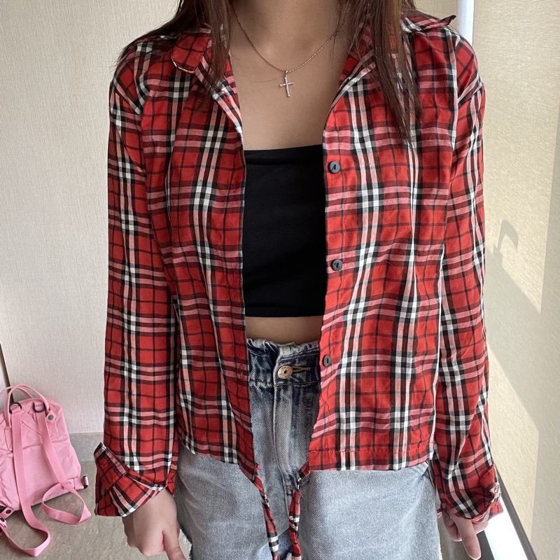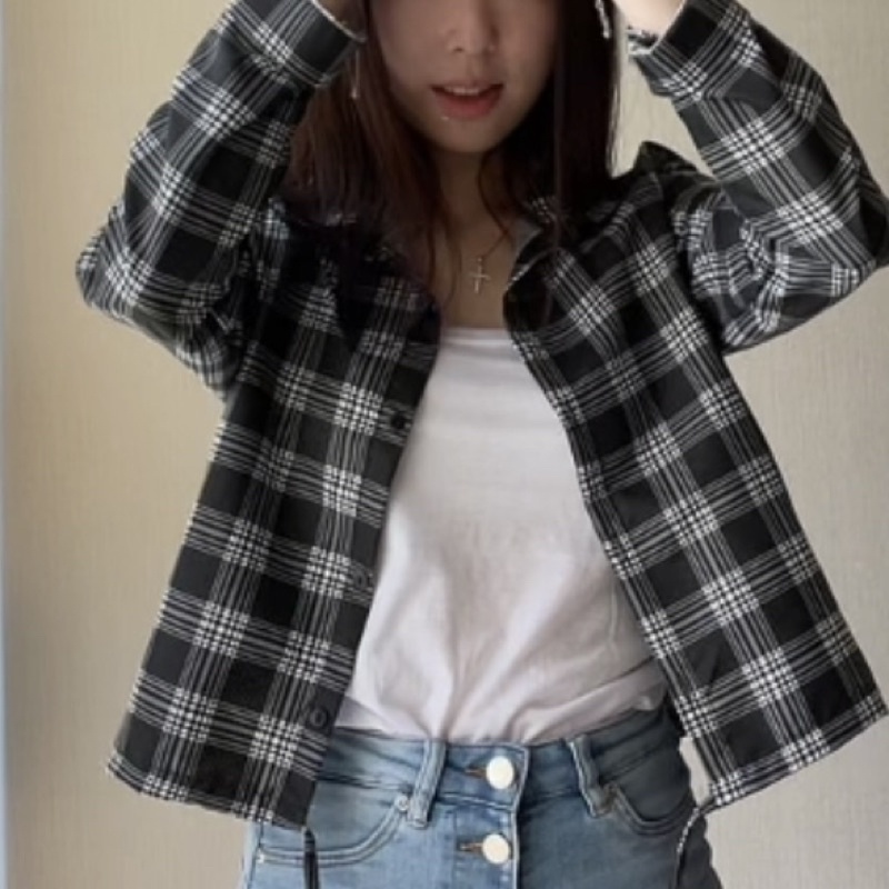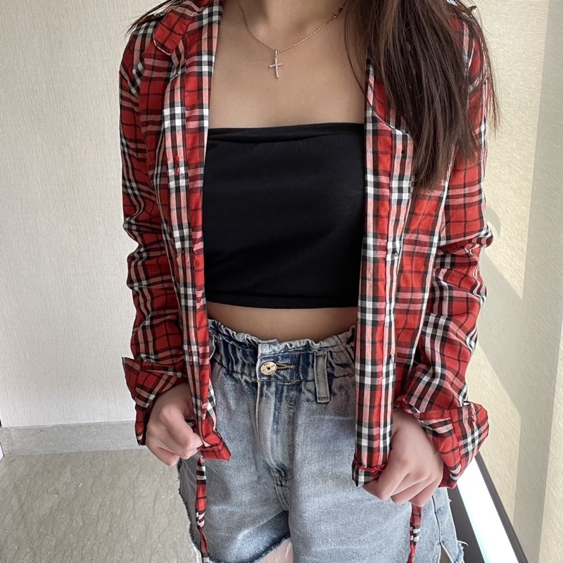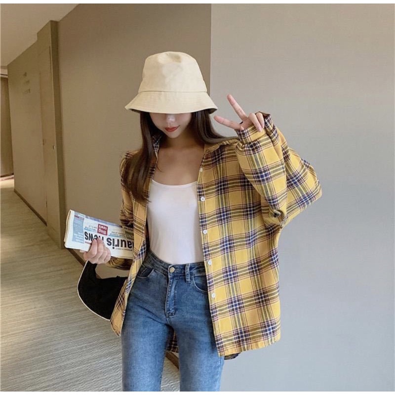 Kemeja Wanita Casual Blouse Kameja Oversize Wanita Lengan Panjang Baju Fashion Mulim Korea Style Kemeja Korea Outer Lengan Panjang Bts Park Jimin Kotak-Kotak Crop Viral Import Koreanstyle