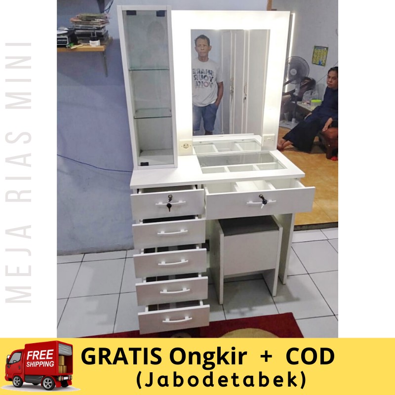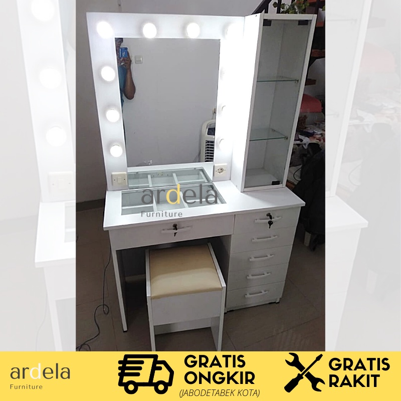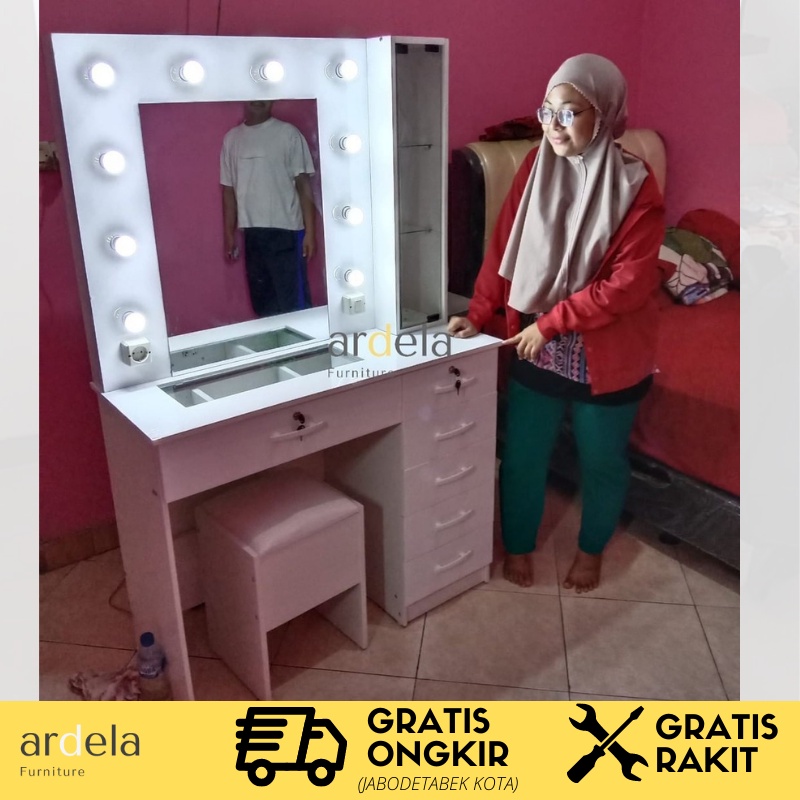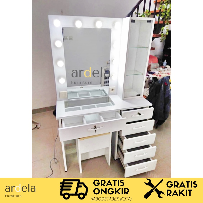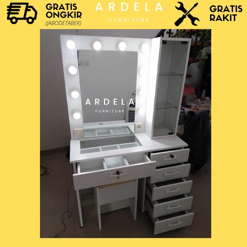 Meja Rias Vanity Mirror Lampu LED Mewah dan Murah Meja Makeup Artist Meja Rias Minimalis Dengan Cermin Luas dan Lampu Terang Meja Laci Bonus Kursi Bonus Lampu Led