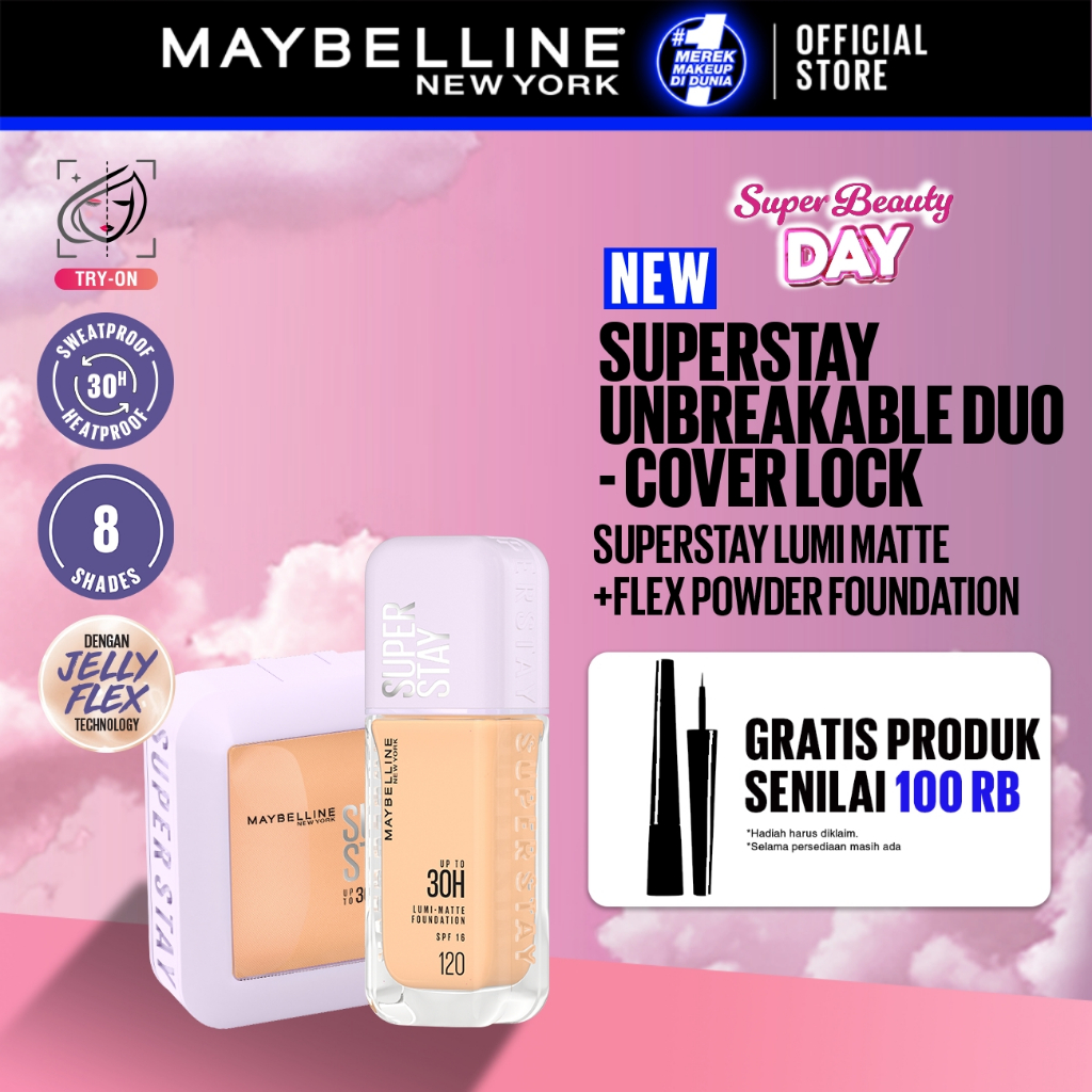 [BARU HANYA DI SHOPEE] MAYBELLINE OFFICIAL Superstay Unbreakable Duo - Superstay Lumi Matte Foundation + Superstay Flex Powder Foundation Liquid Foundation Ringan Tahan Lama Two-Way Cake Oil Control Transferproof Waterproof Skintone Paket Complexion