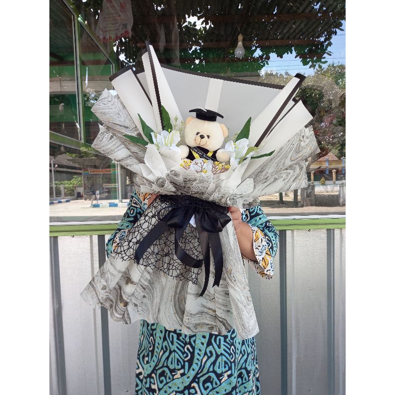 BUKET BONEKA WISUDA HITAM PUTIH MIX BUNGA ARTIFICIAL BUKET BONEKA MURAH REALPICT BUKET WISUDA HADIAH WISUDA BUKET BONEKA MURAH BUKET BUNGA