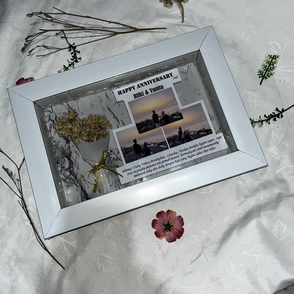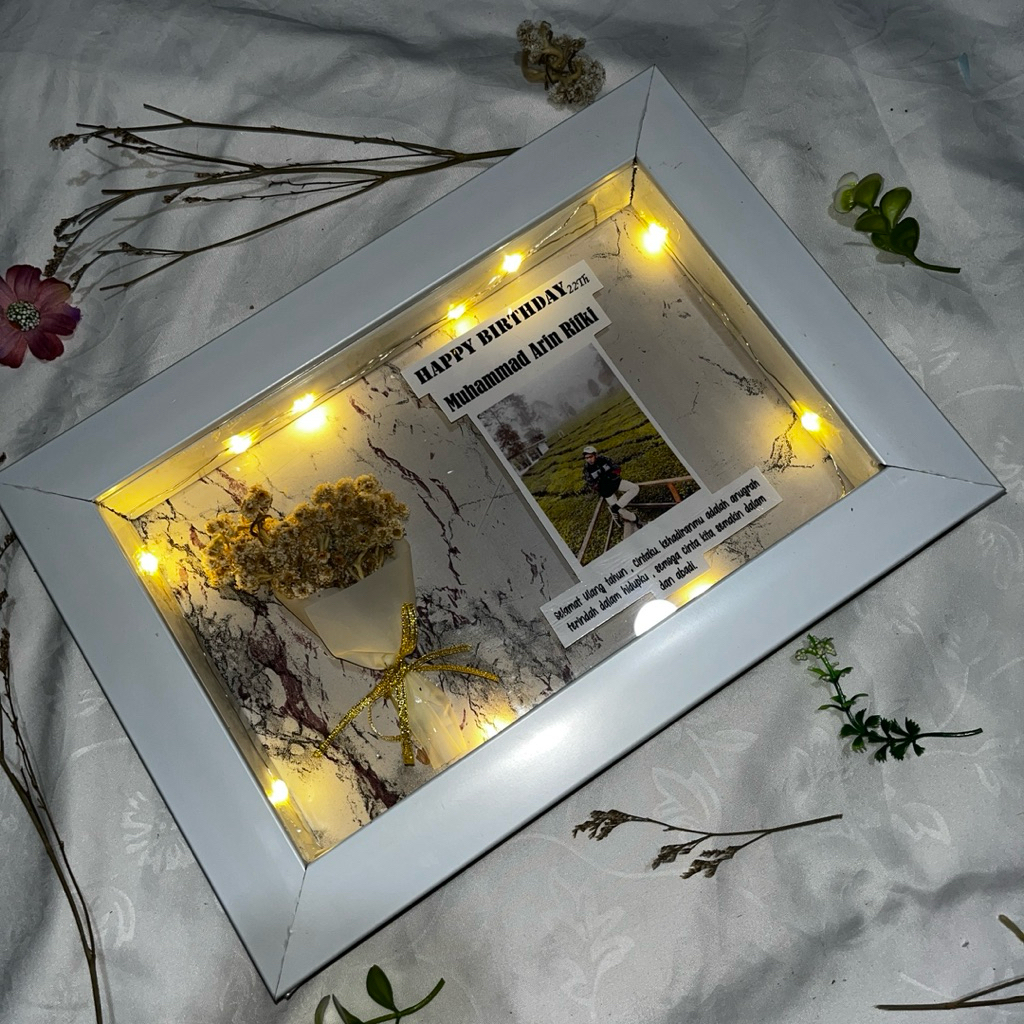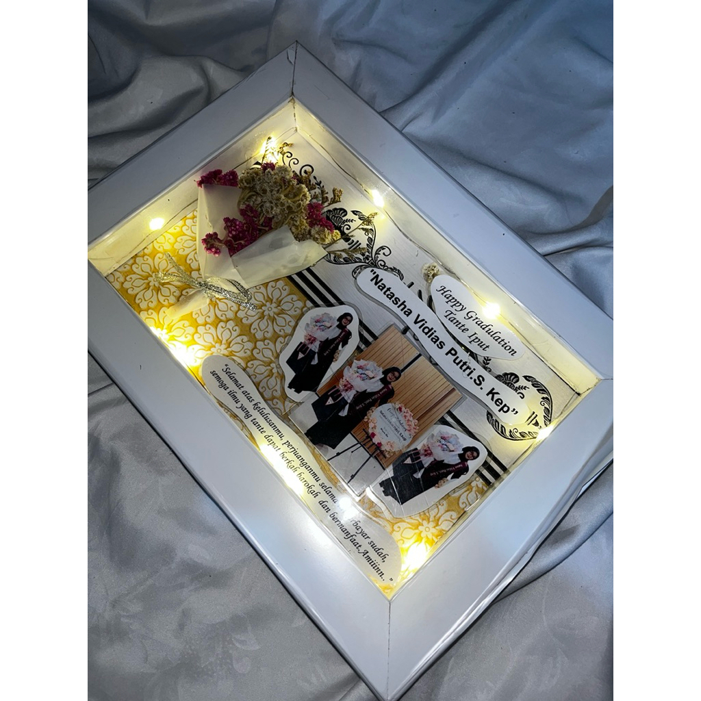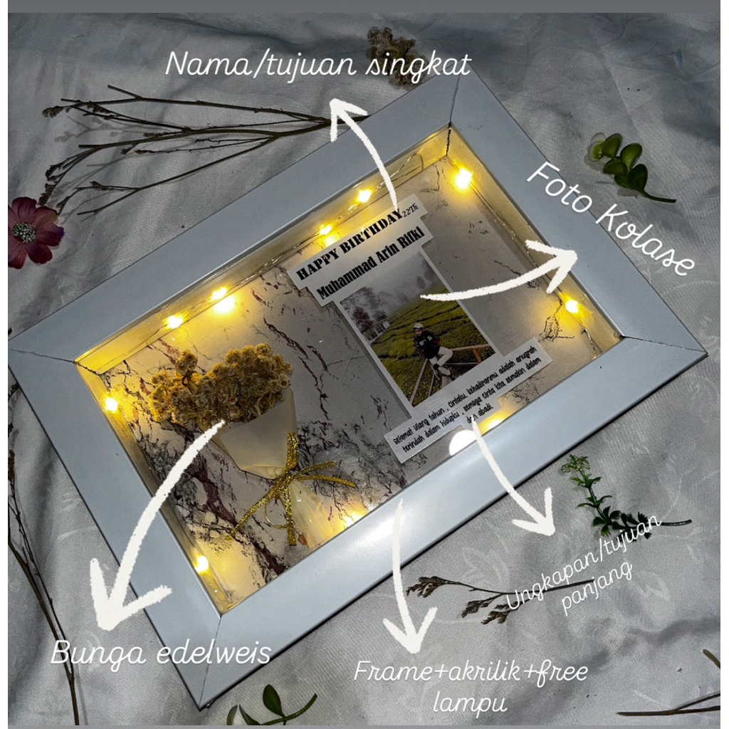 Frame Foto 3d ukuran 20x30/8r Frame Foto Kado Wisuda, Kado Ulang Tahun, Kado Anniversary dengan Bunga eddelwais Free Lampu Kaca Akrilik PVC Putih