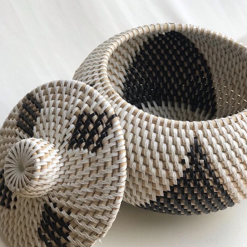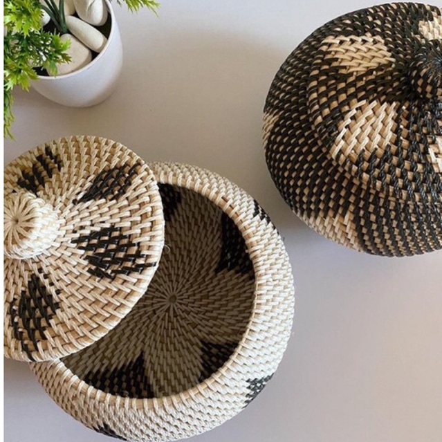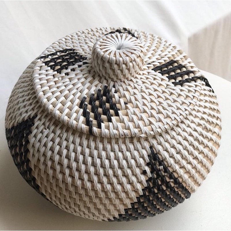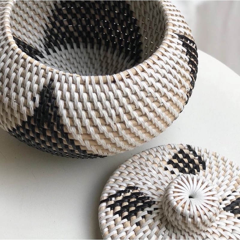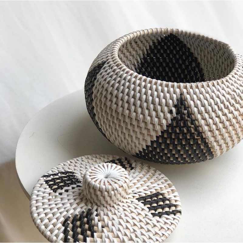 Lombok Authentic | Kayana Jar | Toples Rotan Bulat Motif Hitam Putih Diameter 20cm | Anyaman Kerajinan Lombok