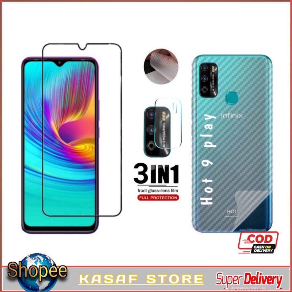Paket 3 IN 1 Tempered Glass Hp Infinix Hot 11 Hot 11 Play Hot 10 Play 10S 9 Play Hot 10 Tg Antigores Kaca Full Cover + Camera Lens + Skin Carbon 3D
