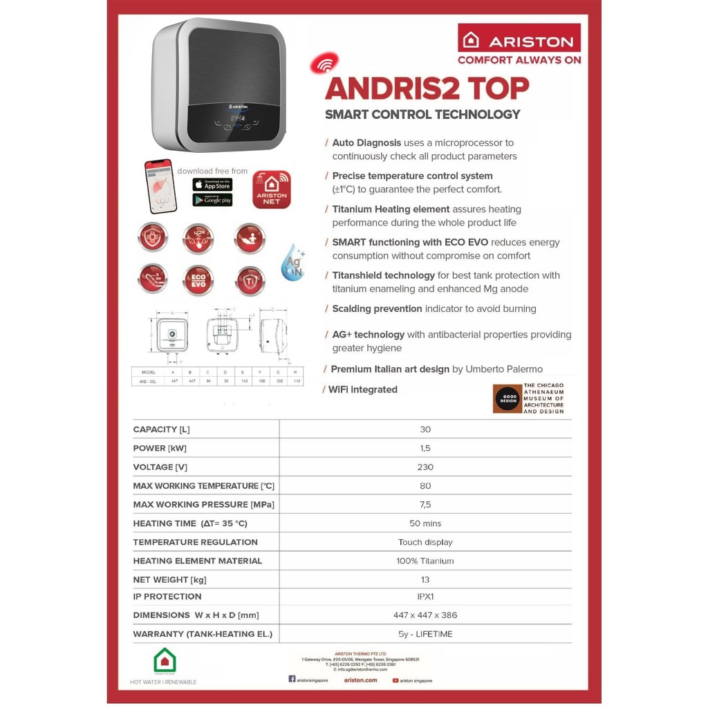 Ariston Andris 2 AN2 TOP Wifi 30 liter 500 watt Water Heater Pemanas Air Hangat Mandi