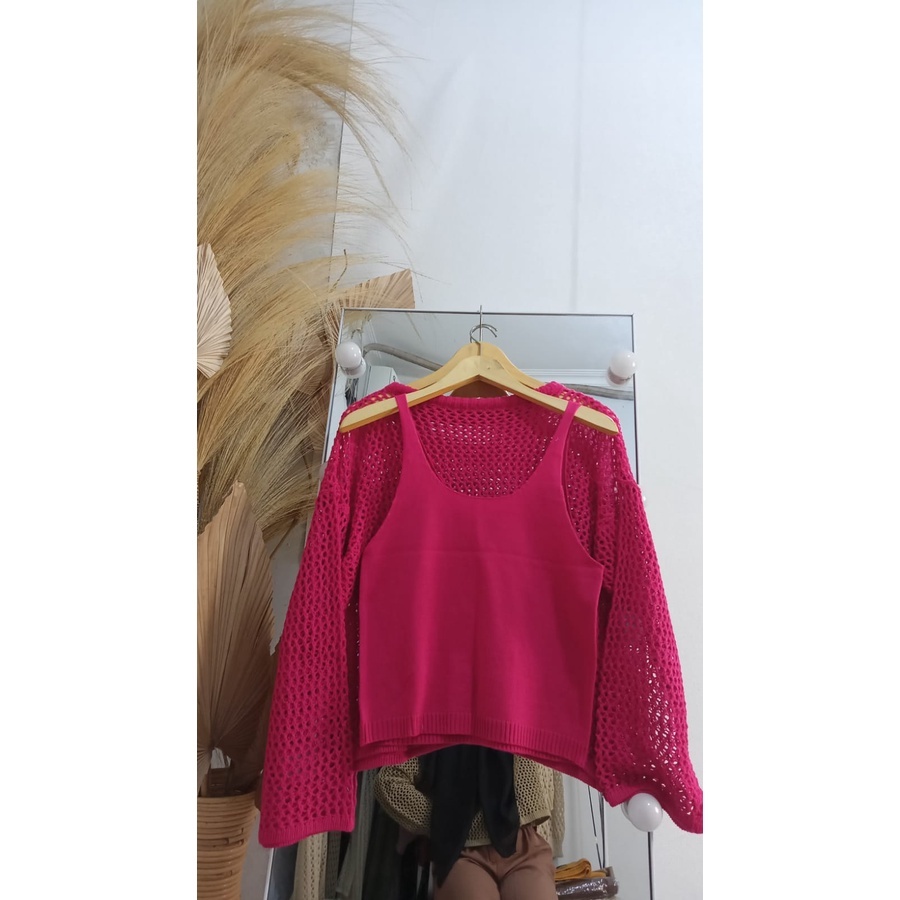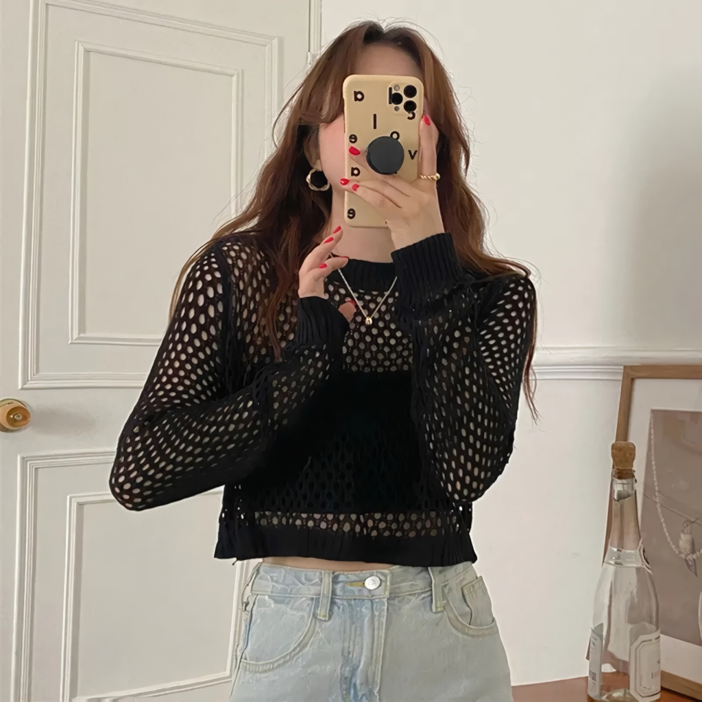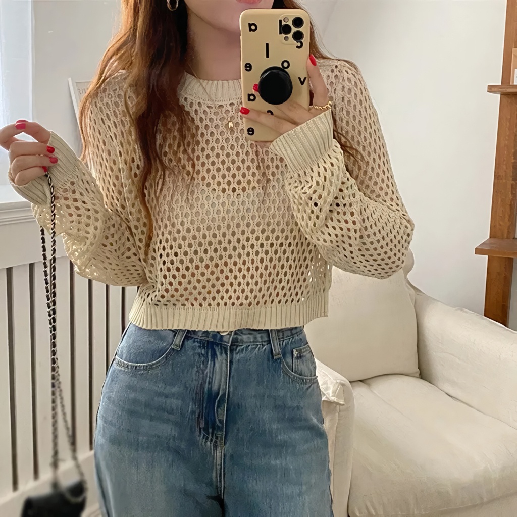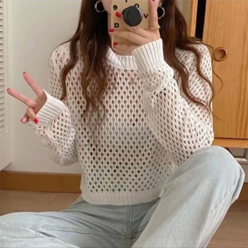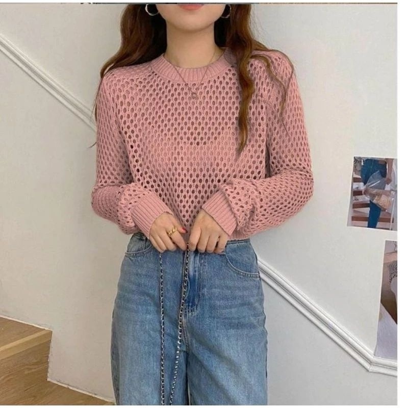 Fuji Sweater Basic Outer Crop Rajut Jaring Ootd Fuji