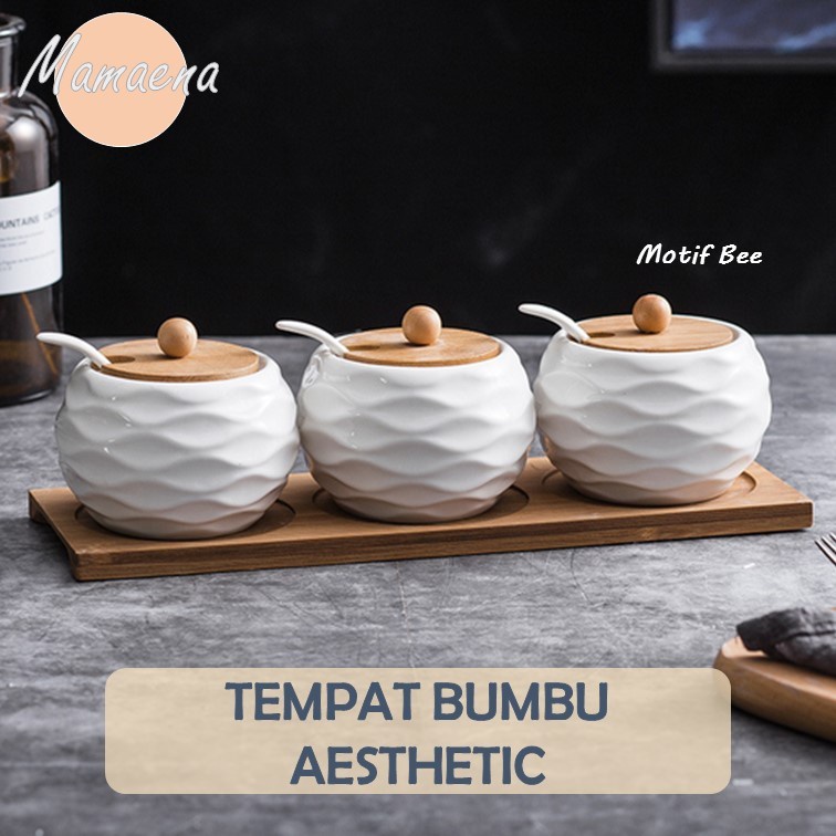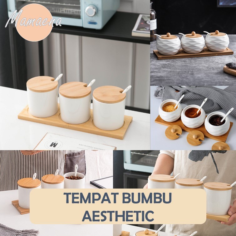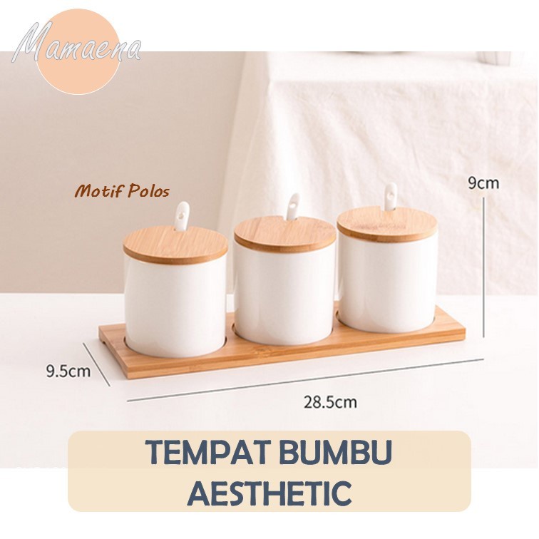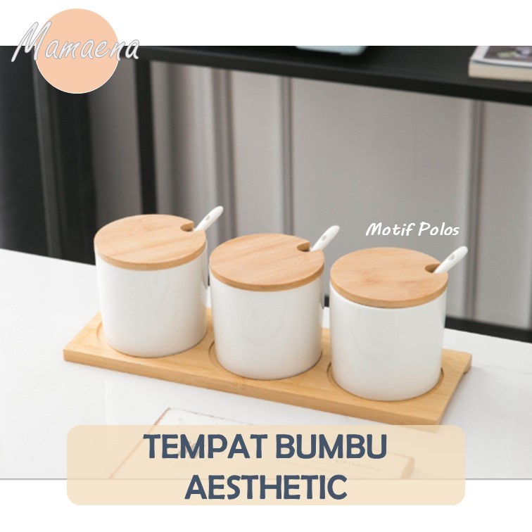 3 in 1 Set Tempat / Wadah Bumbu Dapur Keramik Alas Kayu Unik - Spice Jar Aesthetic