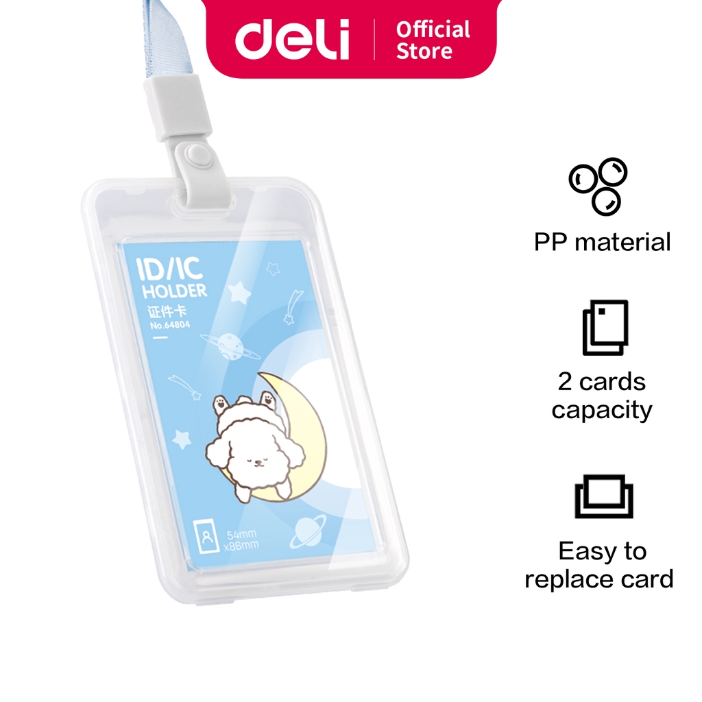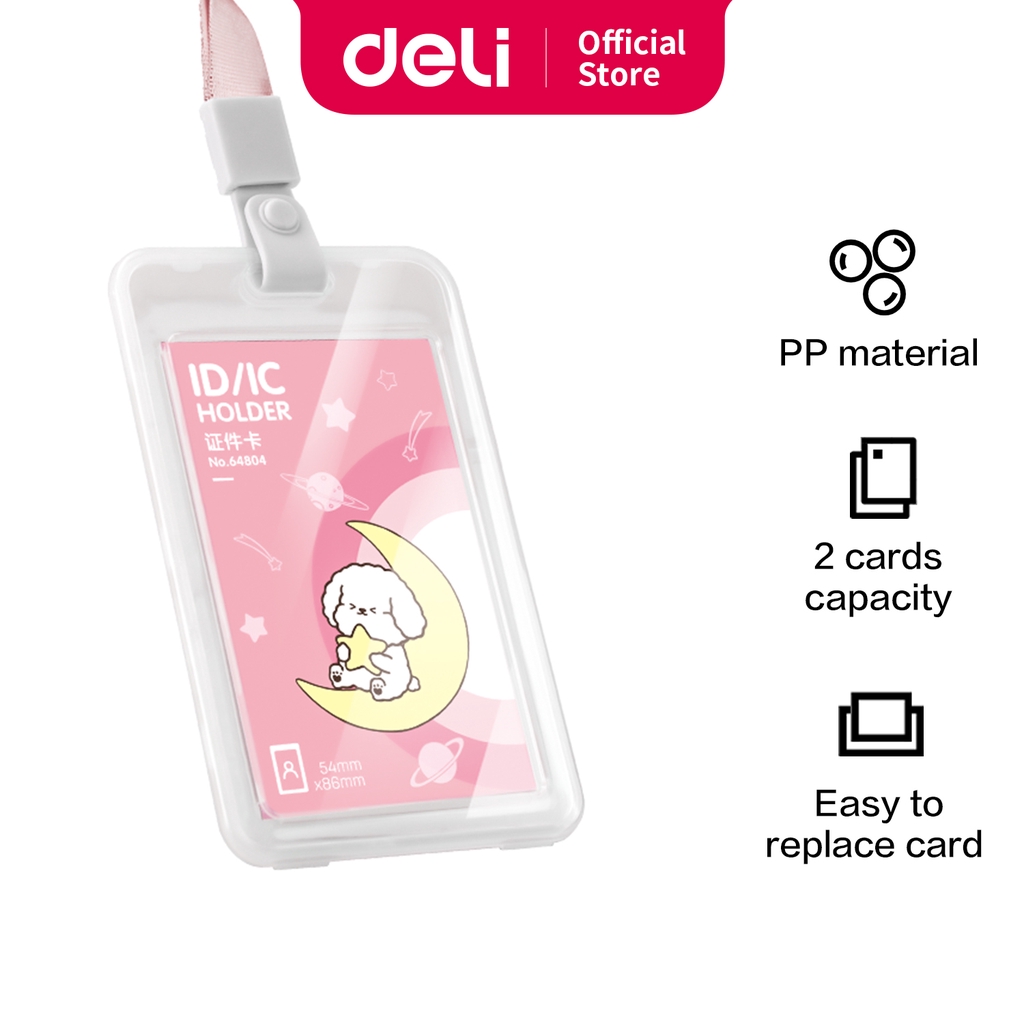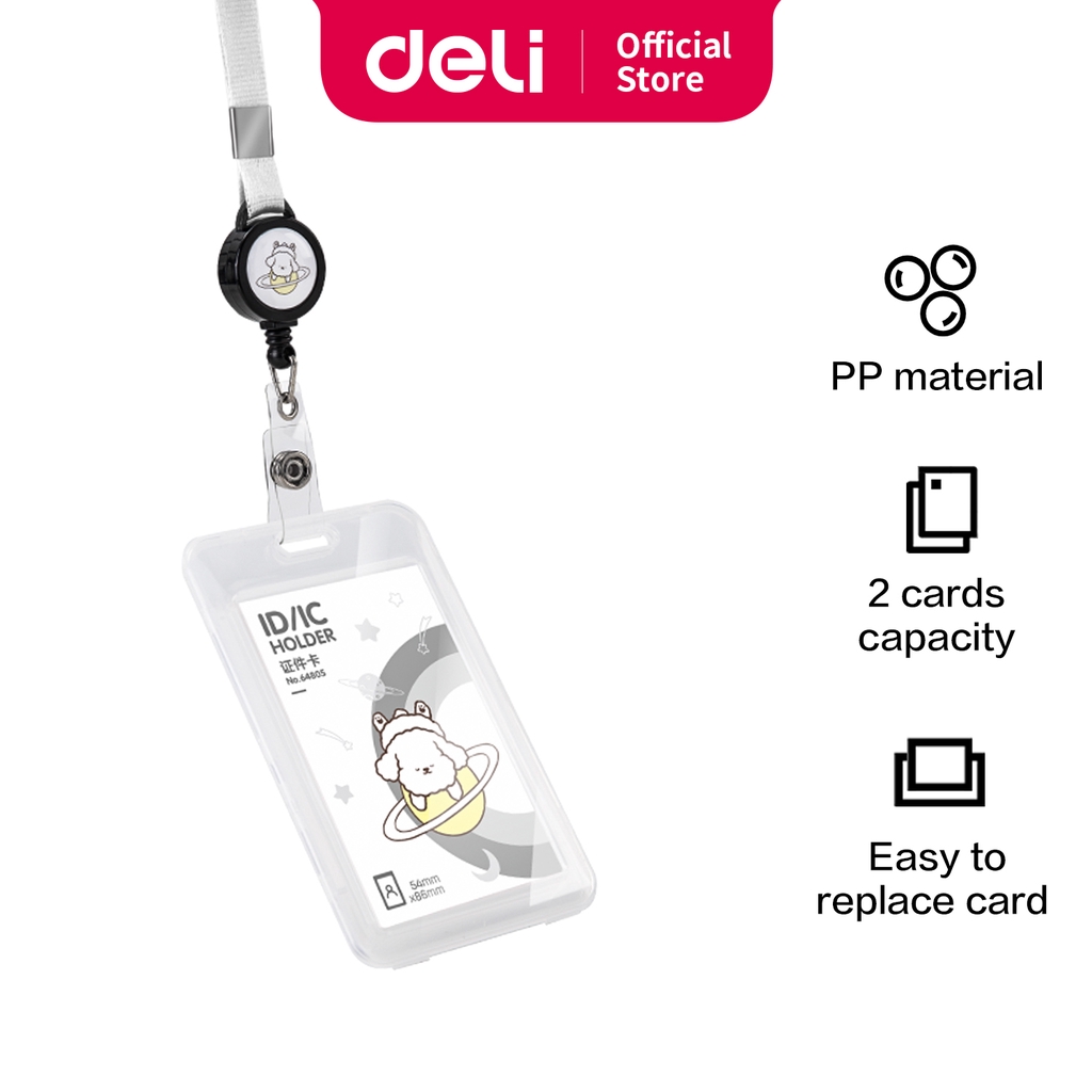 Deli Name Tag Kartu Tanda Pengenal Motif Doodle Warna Putih/Pink/Biru, Lanyard Bisa Ditarik 6480X