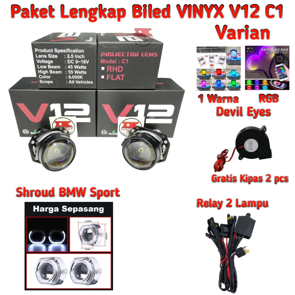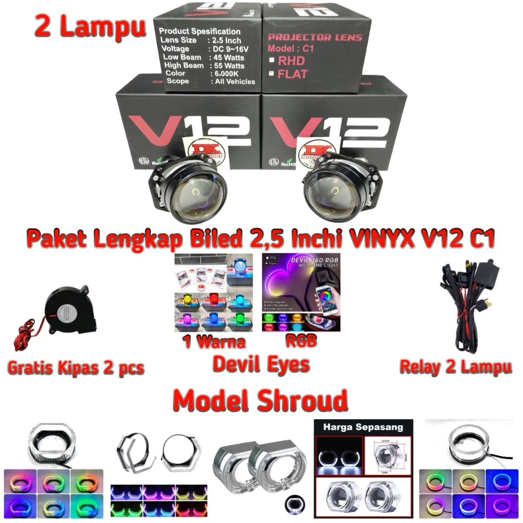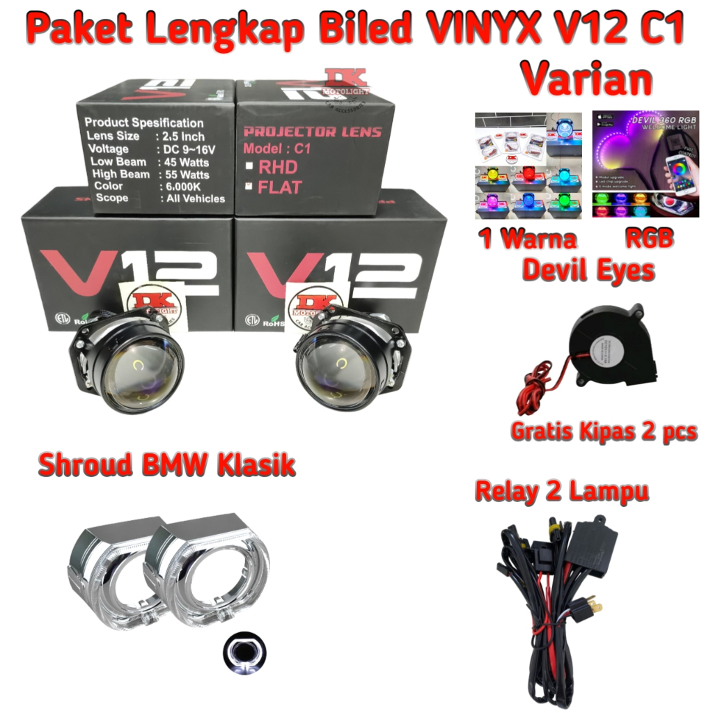 Vinyx V12 C1 Paket 2 Lampu Biled Projector 2,5 Inchi Motor Mobil + Shroud Super Terang Fokus Premium