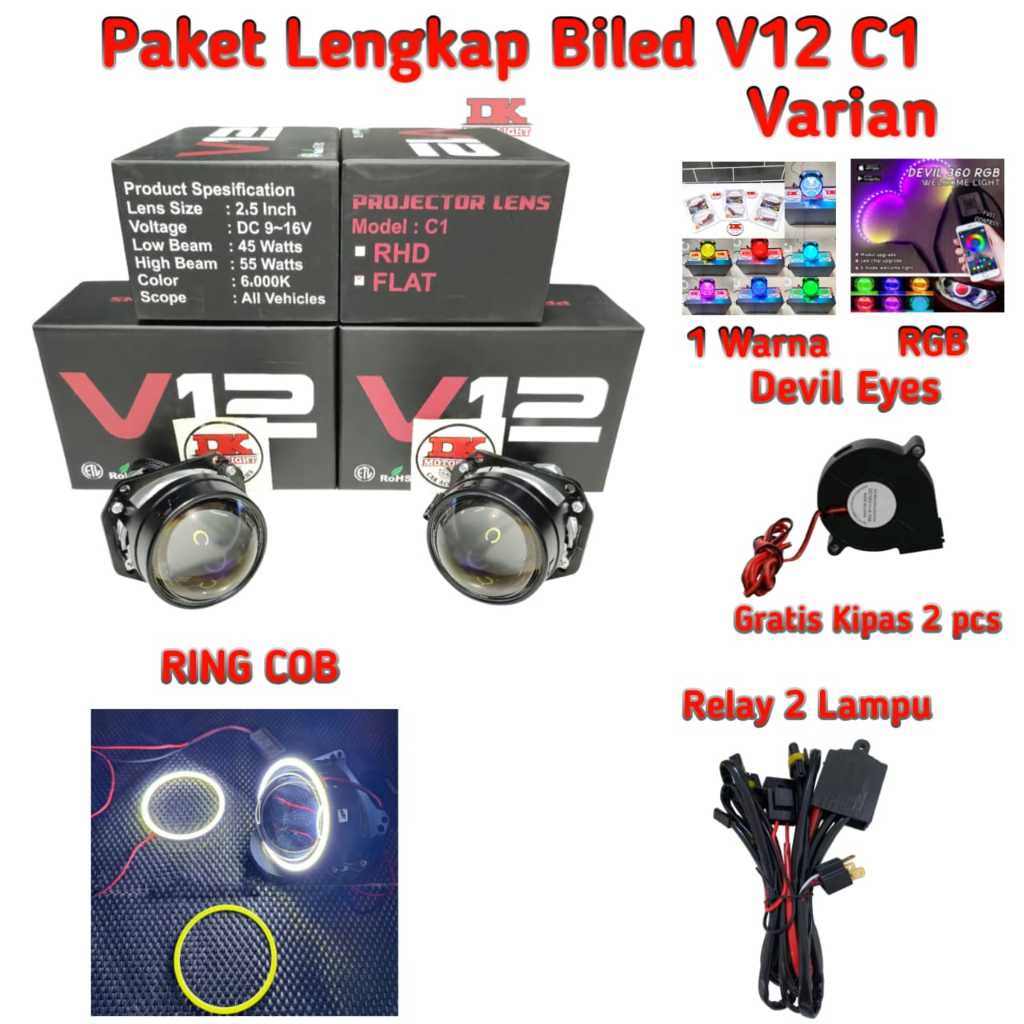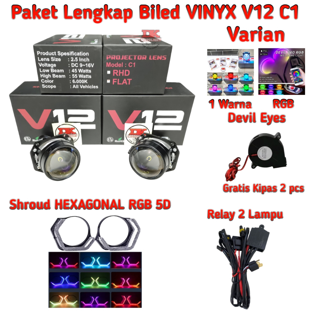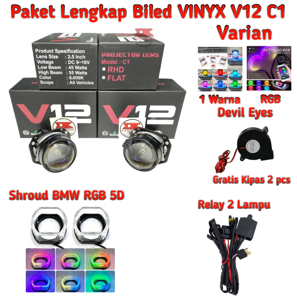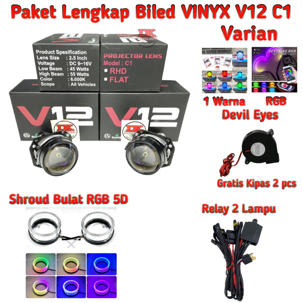 Vinyx V12 C1 Paket 2 Lampu Biled Projector 2,5 Inchi Motor Mobil + Shroud Super Terang Fokus Premium