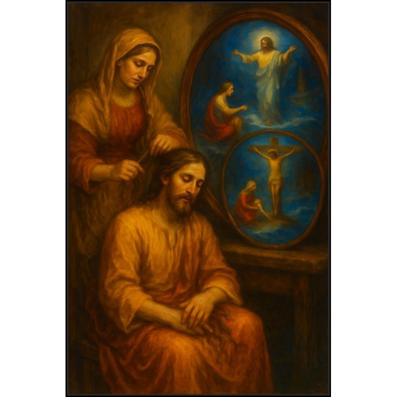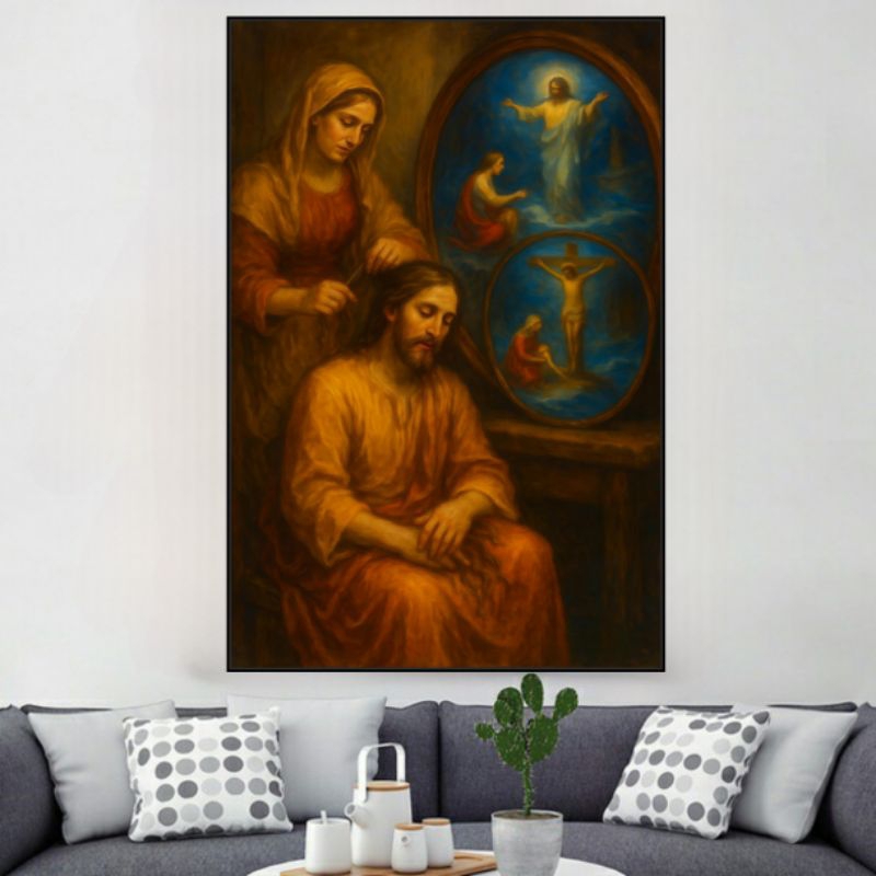Jesus maria Lukisan cetak poster Jesus getting his hair dekorasi rumah ruangan tamu kamar tidur pajangan keagamaan kristen Katolik protestan ortodoks