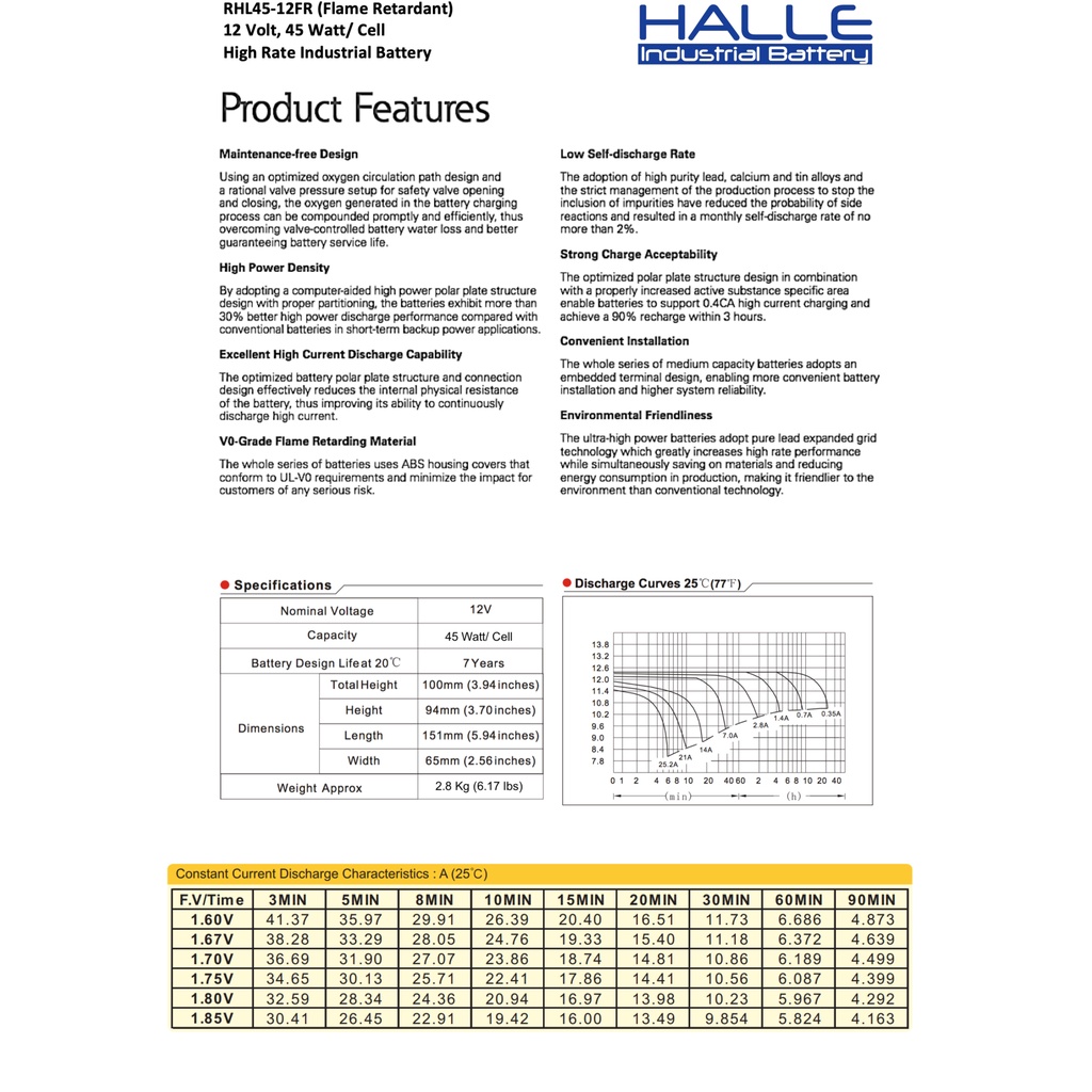 Baterai UPS HALLE RHL45-12FR 12V 45W 12V 9AH VRLA Industrial Battery