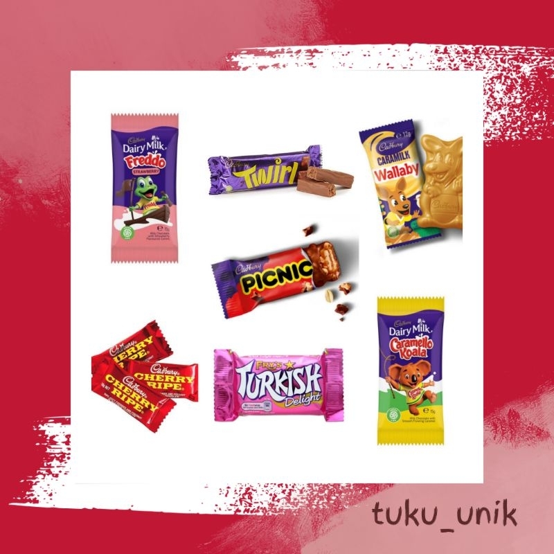(Bisa COD)Ready Stok Coklat/Cokelat/ Chocolate Cadbury Australia Cherry Ripe, Caramello Koala, Turkish,Twirl, Picnic, Freddo Strawberry, Wallaby (ECER)