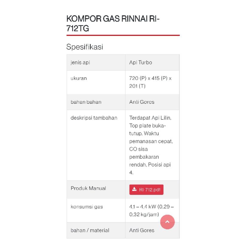 Kompor Gas Rinnai RI-712TG Burner Api Tornado Anti Gores Garansi Katup 5Tahun