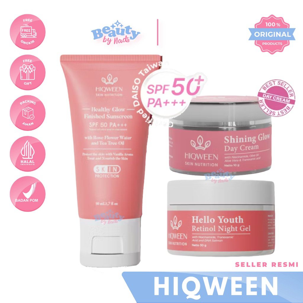 BEAUTYBY.NADS | HIQWEEN SUNSCREEN DAY CREAM NIGHT GEL HEALTHY GLOW FINISHED SUNSCREEM SPF 50 PA+++ SUN SCREEN TABIR SURYA SHINING GLOW DAY CREAM HELLO YOUTH RETINOL NIGHT CREAM GEL BY HIQWEEN