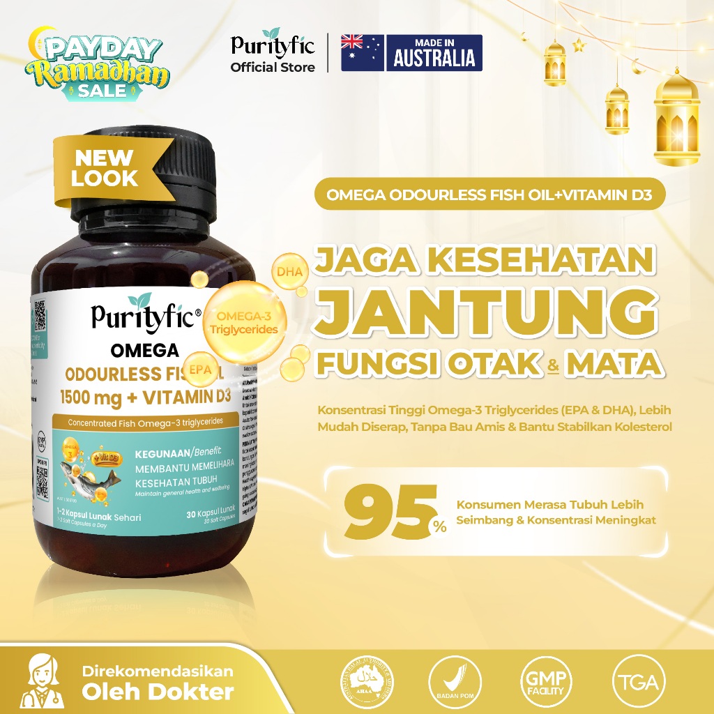 Purityfic Omega Odourless Fish Oil 1500 mg + Vitamin D3 – Vitamin Australia 30 Tablet Lunak