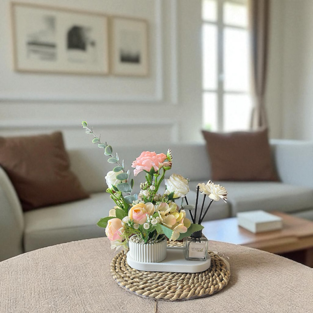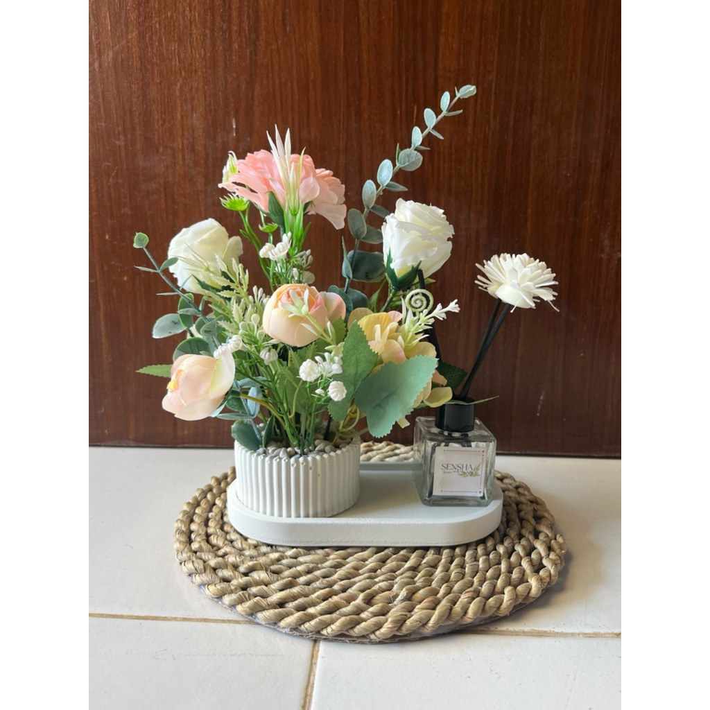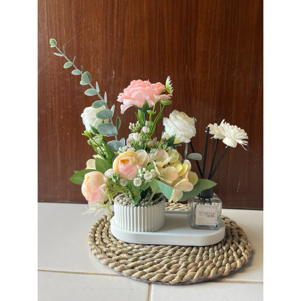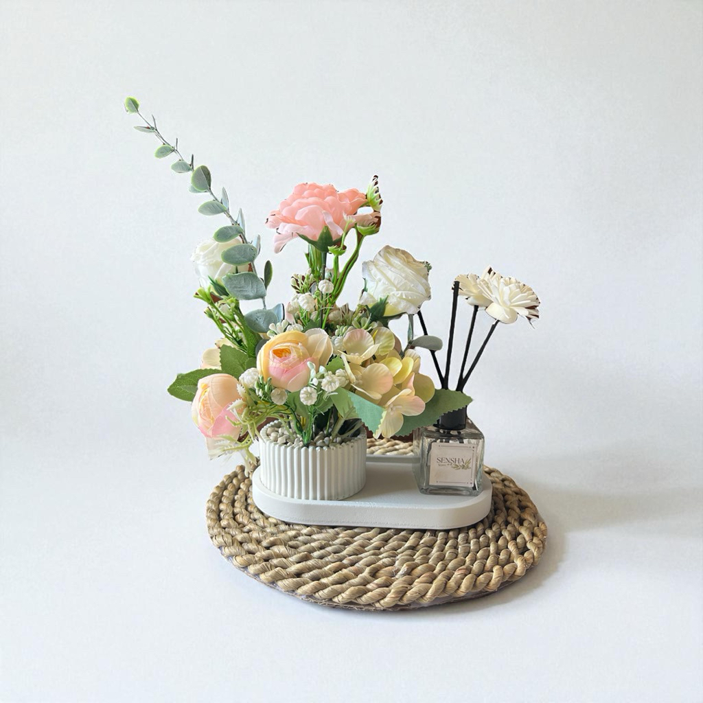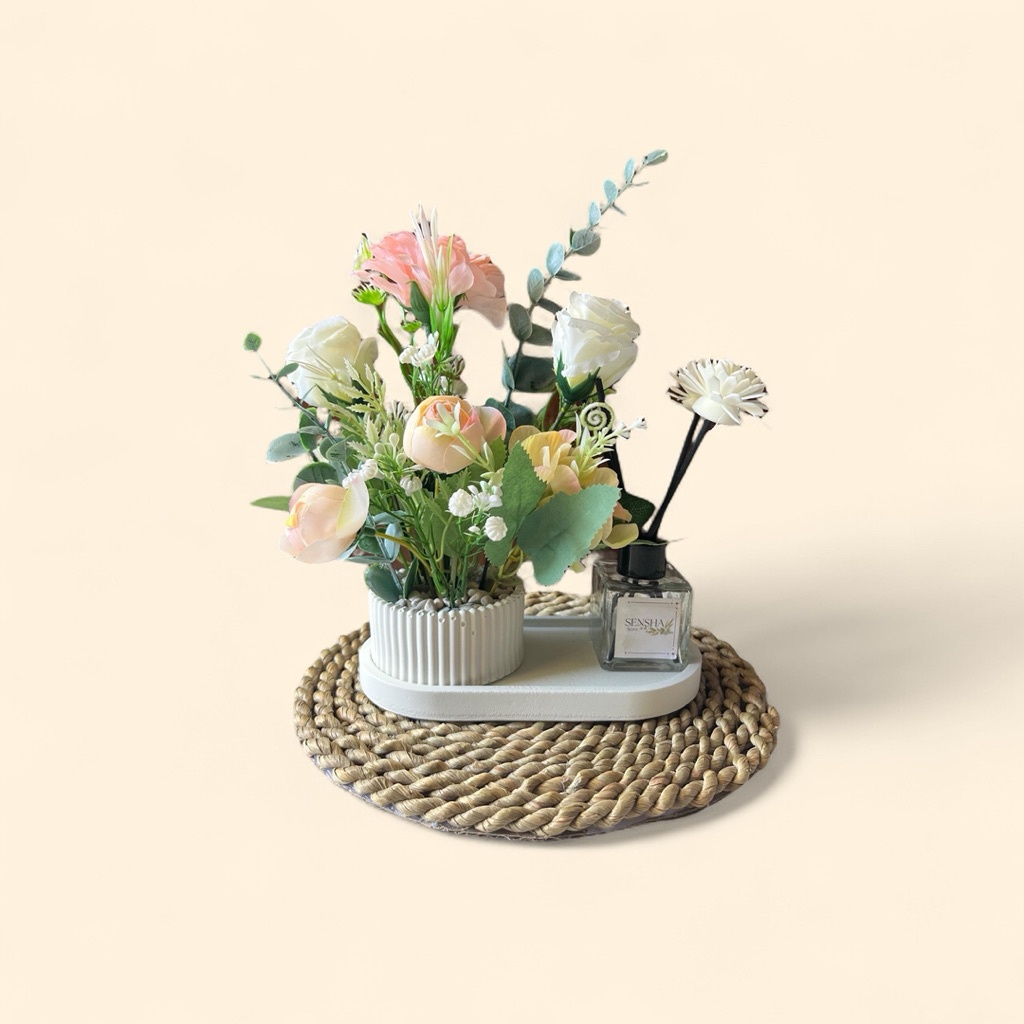 SENSHA GALERIA HIASAN RANGKAIAN BUNGA ARTIFICIAL MIX LENGKAP DENGAN PENGHARUM RUANGAN DIFFUSER, HIASAN MEJA HIASAN SUDUT RUANG DEKORASI RUMAH HOME DECOR