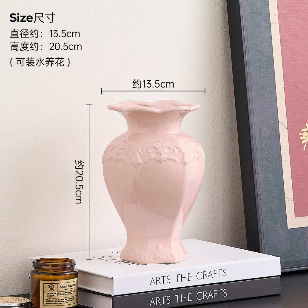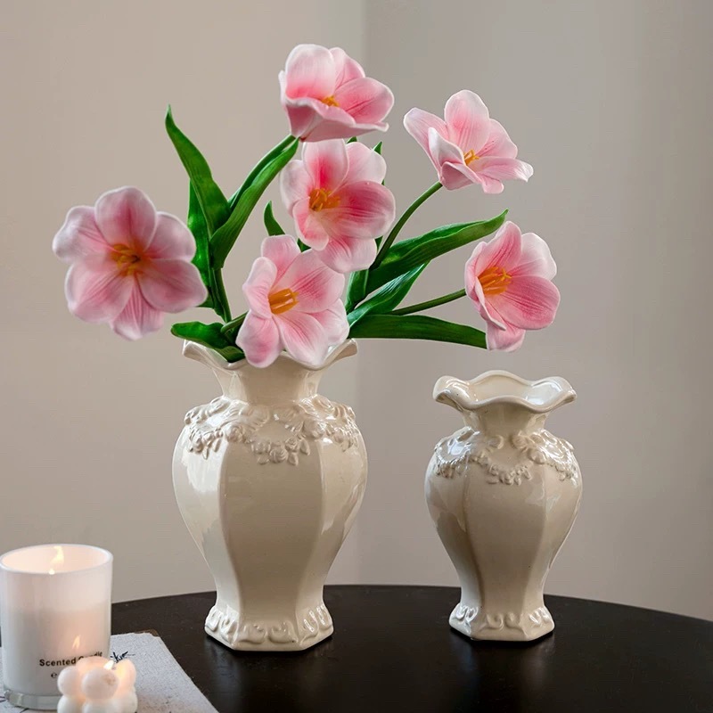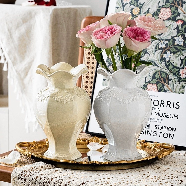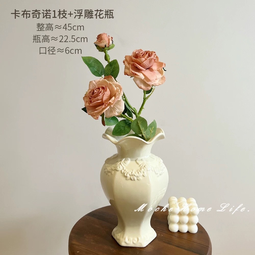 Eyre Vas relief seni Eropa krim mawar simulasi bunga mawar tepi gelombang bunga vas heksagonal ruang tamu rangkaian bunga desktop art relief vase cream color rose simulation flower wave edge hexagonal vase living room desktop flower arrangement