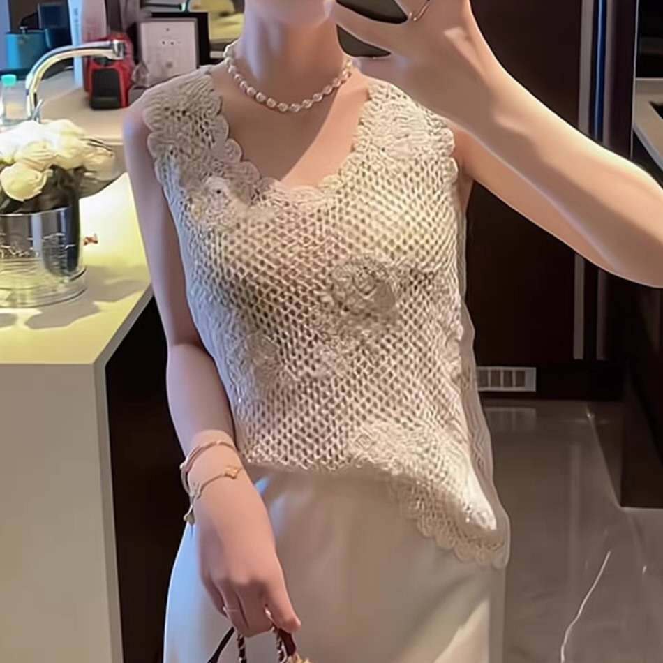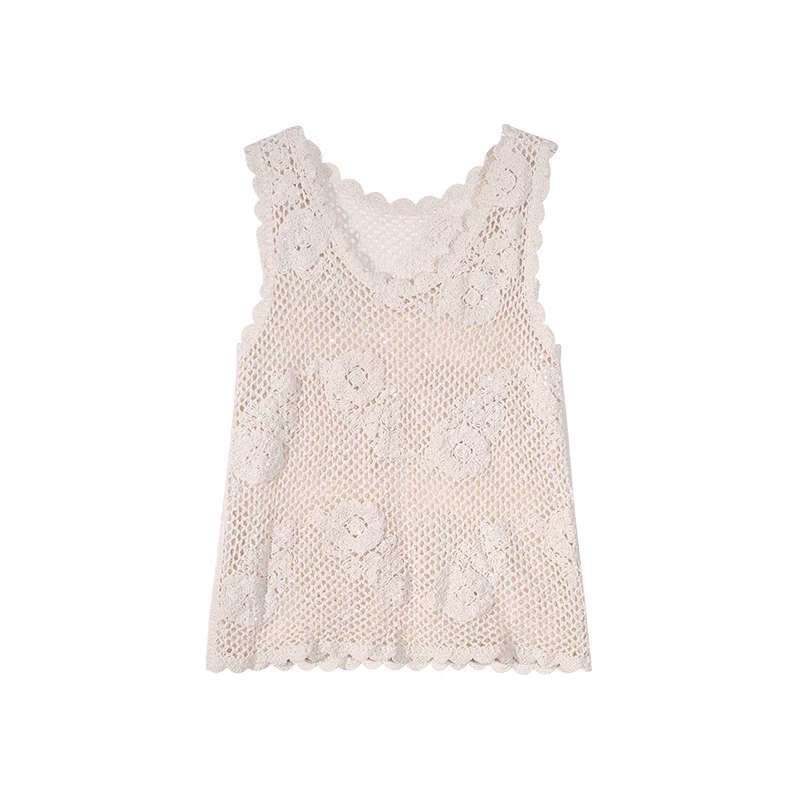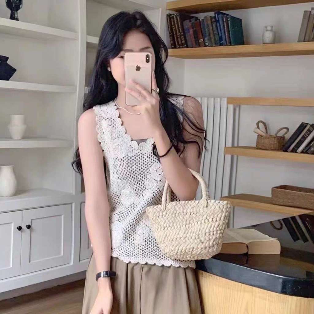 Rompi Vest Rajut Motif Mawar Krem Tank Top Wanita Korea Style