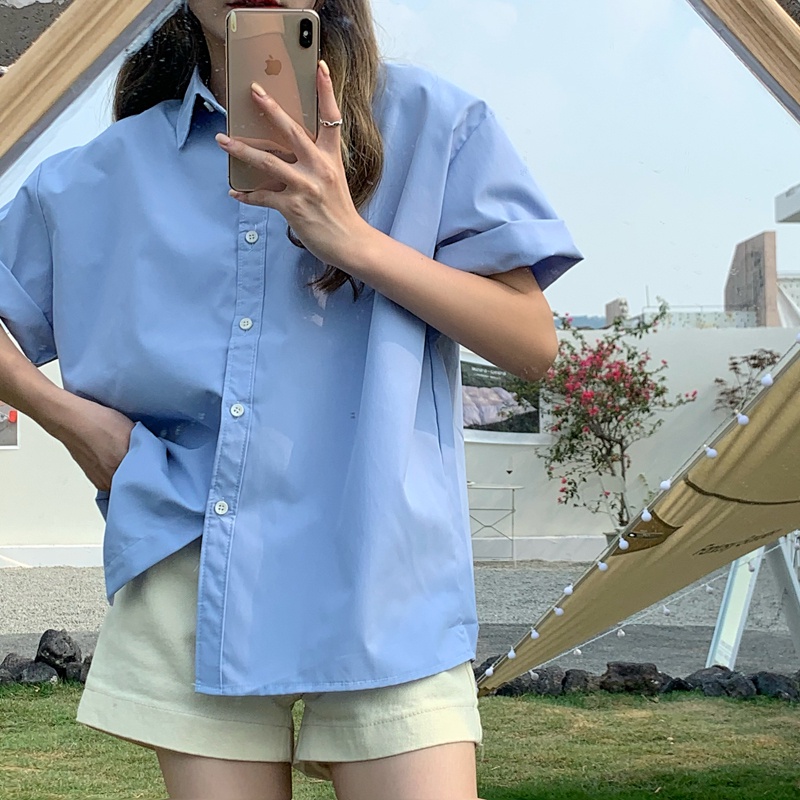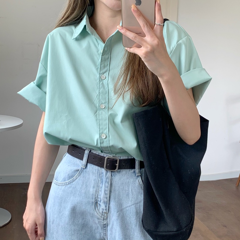 YURUMA Kemeja Retro Wanita Lengan Pendek Warna Solid Atasan Simpel Longgar Cocok Untuk Semua