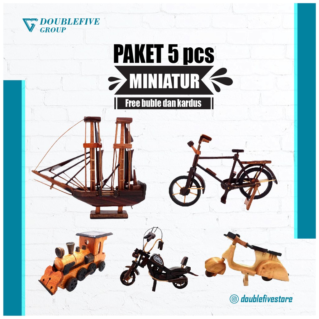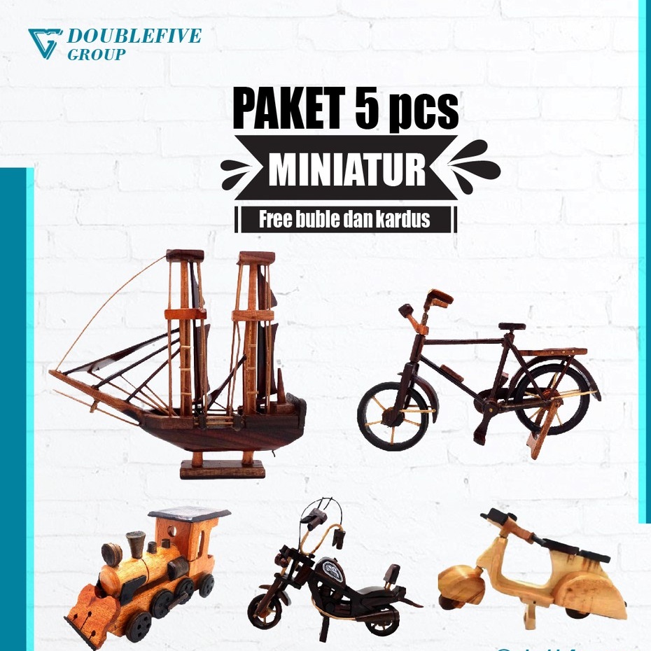 Miniature Paket E isi 5pcs - Miniatur dari Kayu [Becak,Vespa,kapal Pinisi,Sepeda,Kereta,Harley]