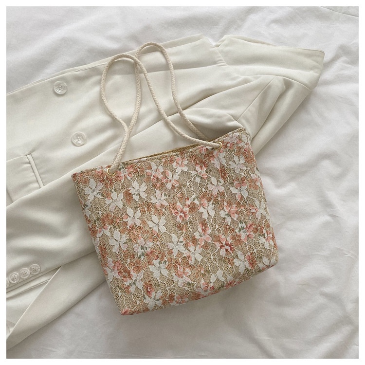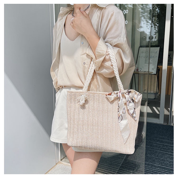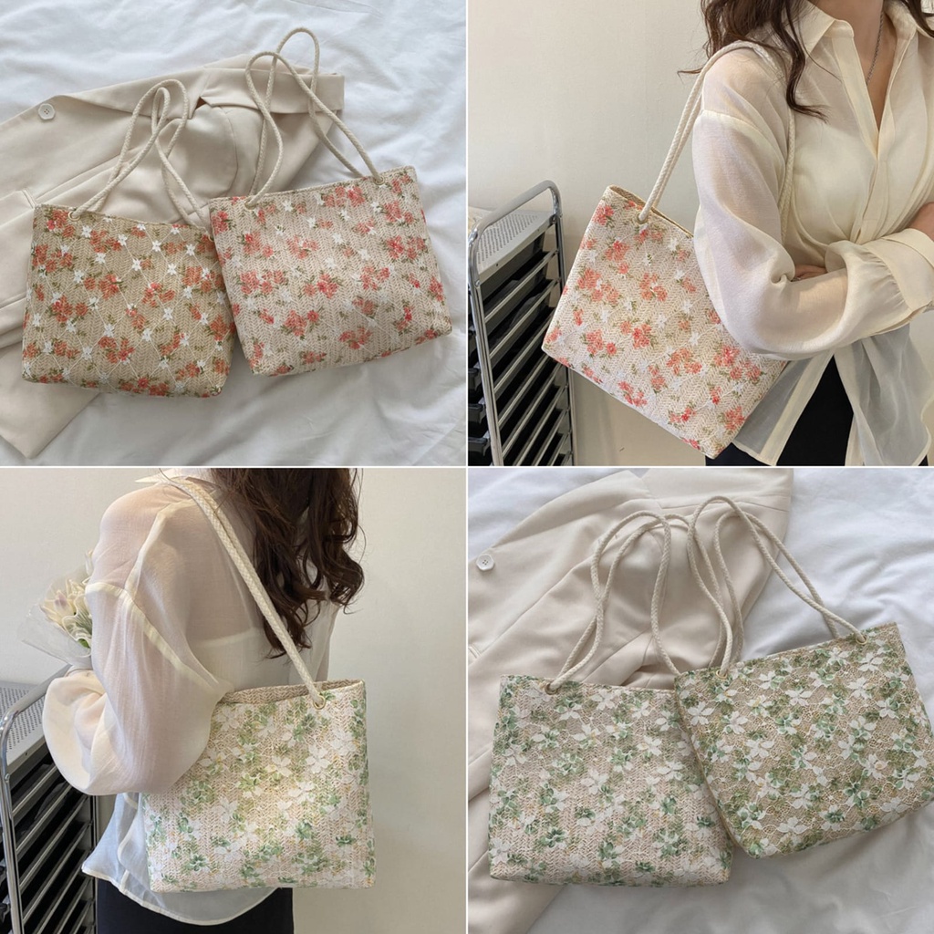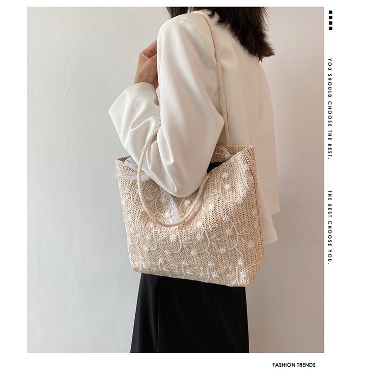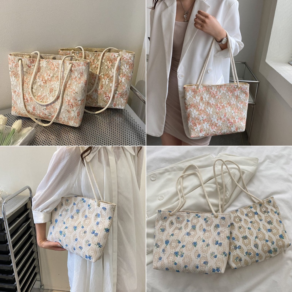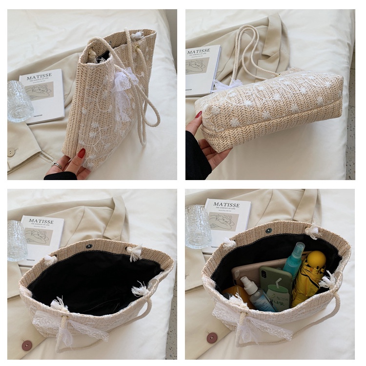 DBCOL Tas Tote Wanita Bahan Anyam Jerami Motif Lace Pita/Totebag Fashion Korea Motif Lace Pita Impor