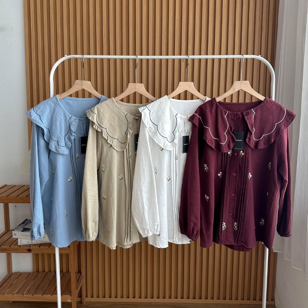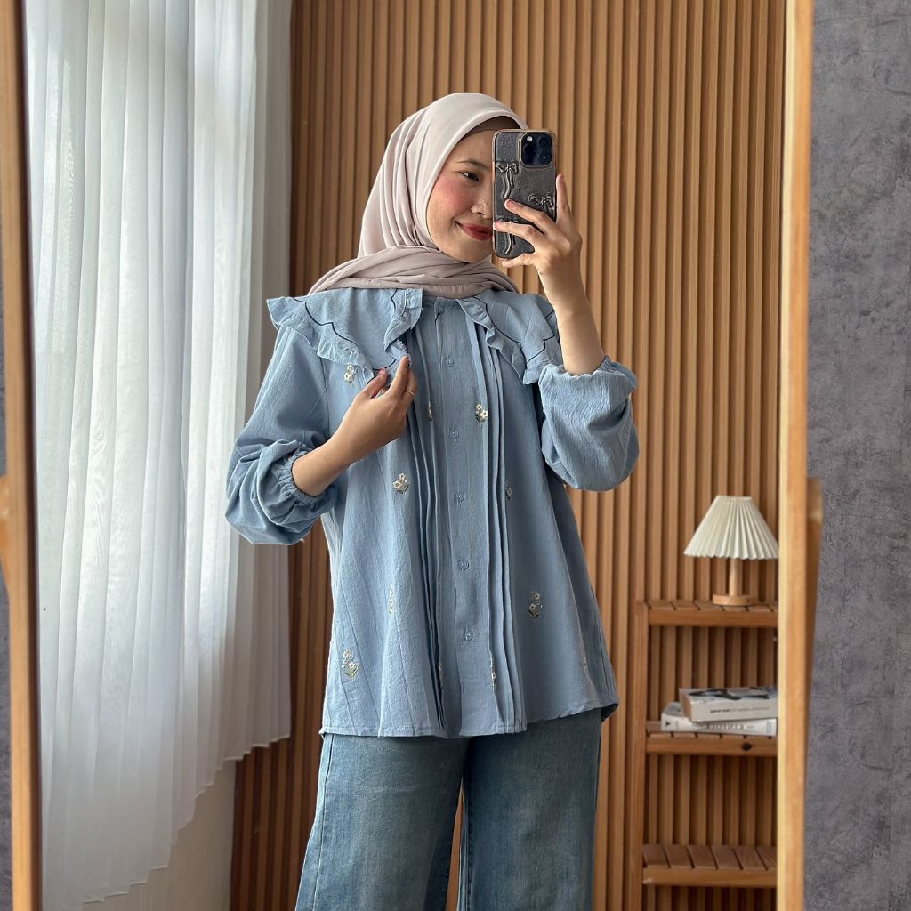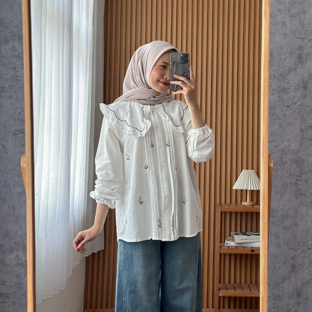 kylie Blouse Wanita Kelinian Kemeja Wanita Lengan Panjang Kekinian Kemeja Bordir Cantik - Linen Premium