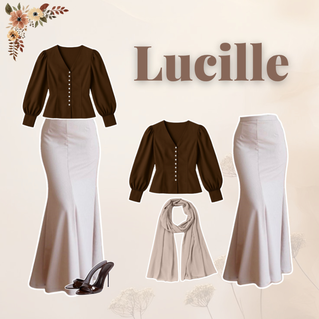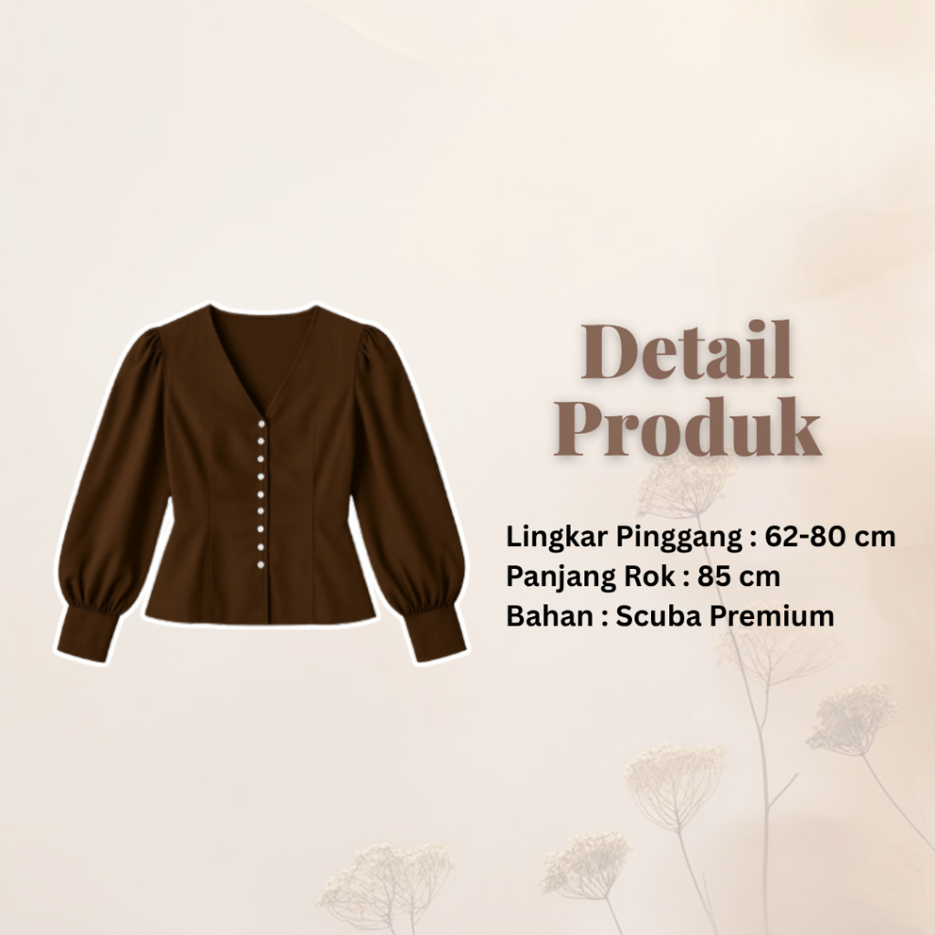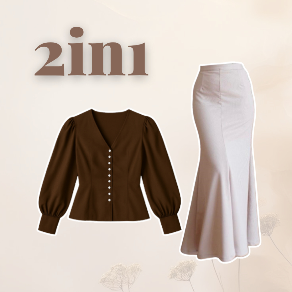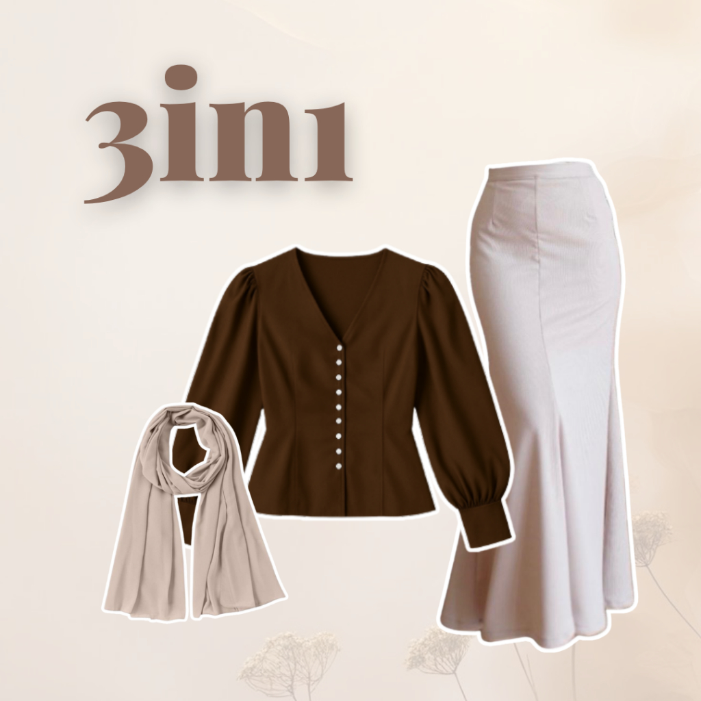 One Set Hijab Kuliah | Blouse Coklat Rok Duyung Beige Pashmina | Outfit 3in1 Wanita Trend OJ113