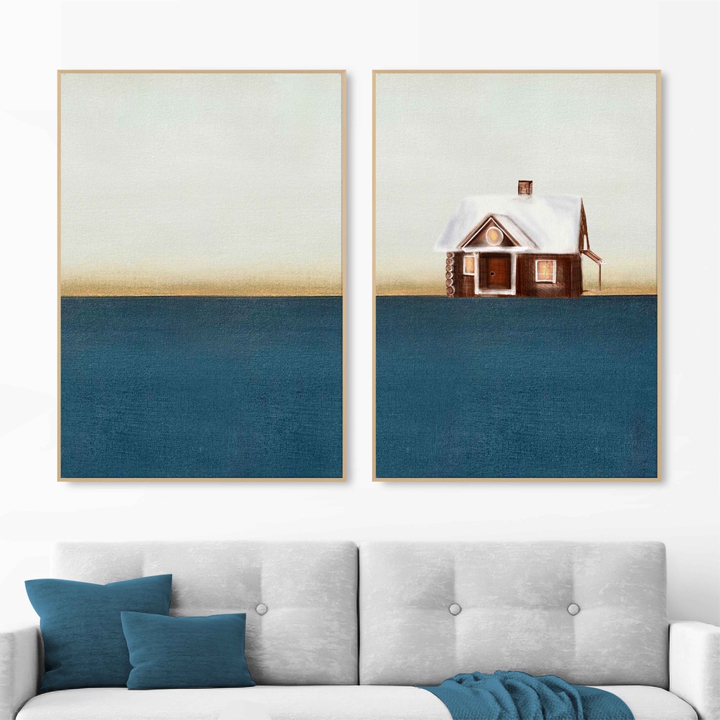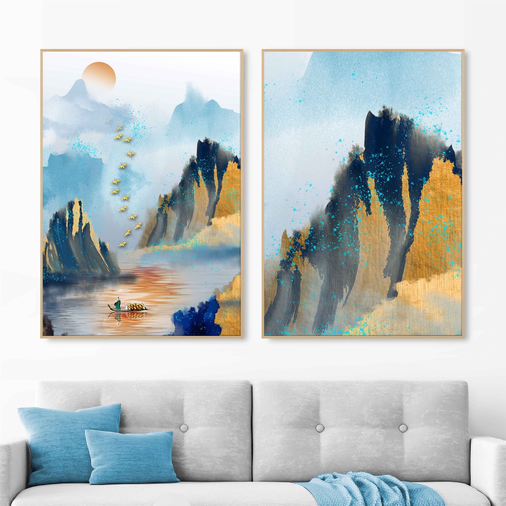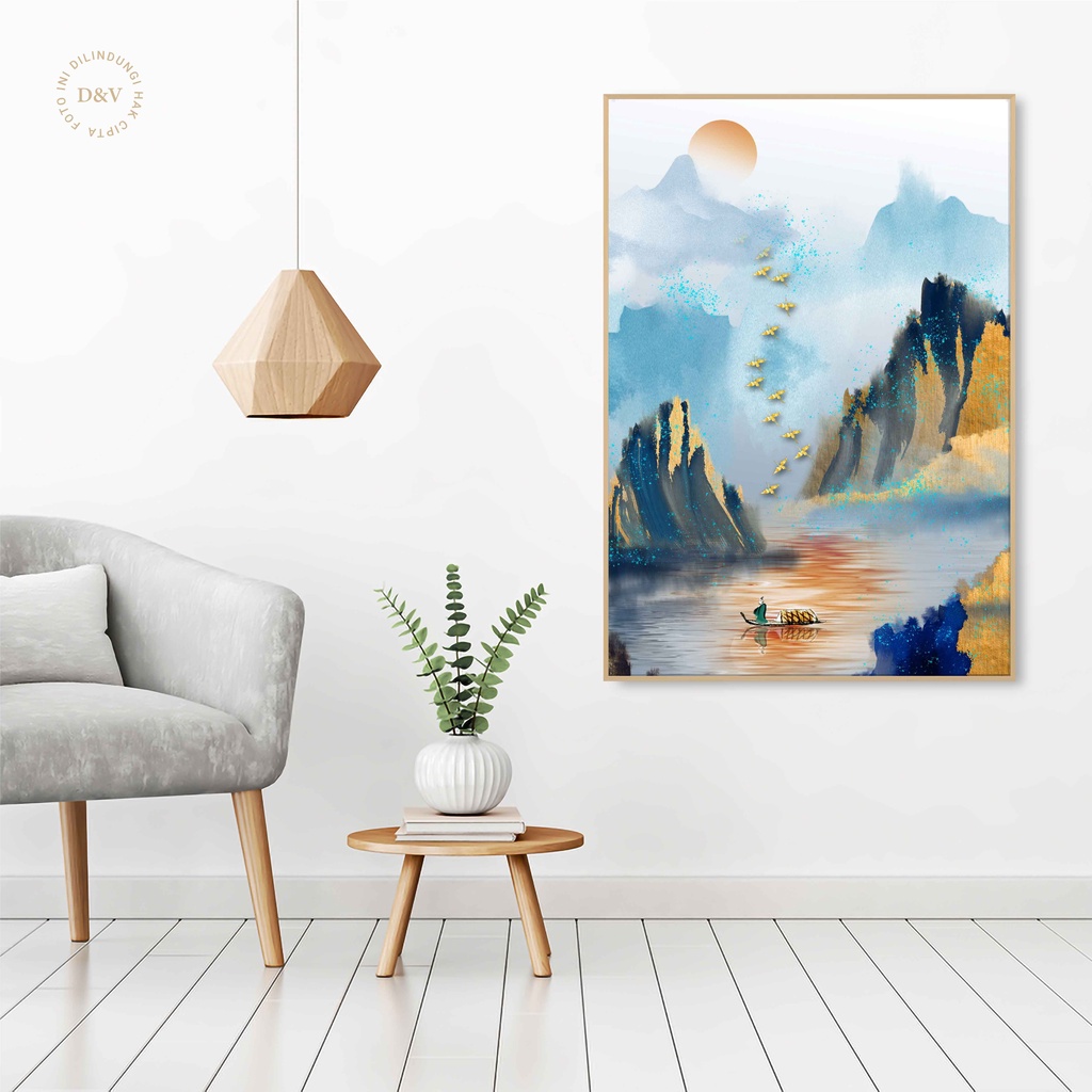 Hiasan Dinding Ruang Tamu Minimalis 80x57cm & 40x57cm INCLUDE FRAME - Wall Decor Panorama Blue And White Estetik Simple Design - Hiasan Dinding Pegunungan Biru - Wall Decor Ruang Tamu Kamar Pajangan Rumah Lukisan Canvas Rumah Home Decor Aesthetic