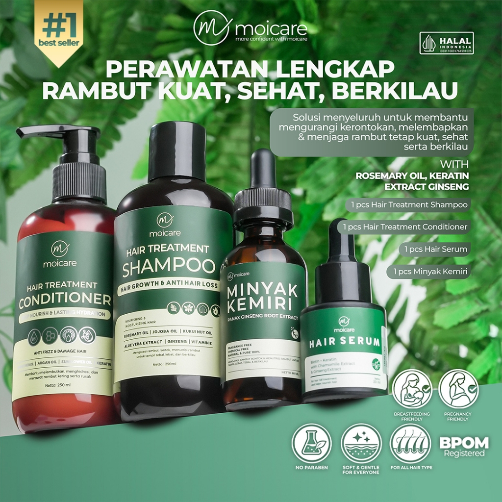 Moicare Paket Lengkap 4 pcs Perawatan Rambut | Hair Treatment Shampoo 250ml + Hair Treatment Conditioner 250ml + Hair Serum 20ml + Minyak Kemiri 60ml | Melebatkan Mengkilapan Rambut