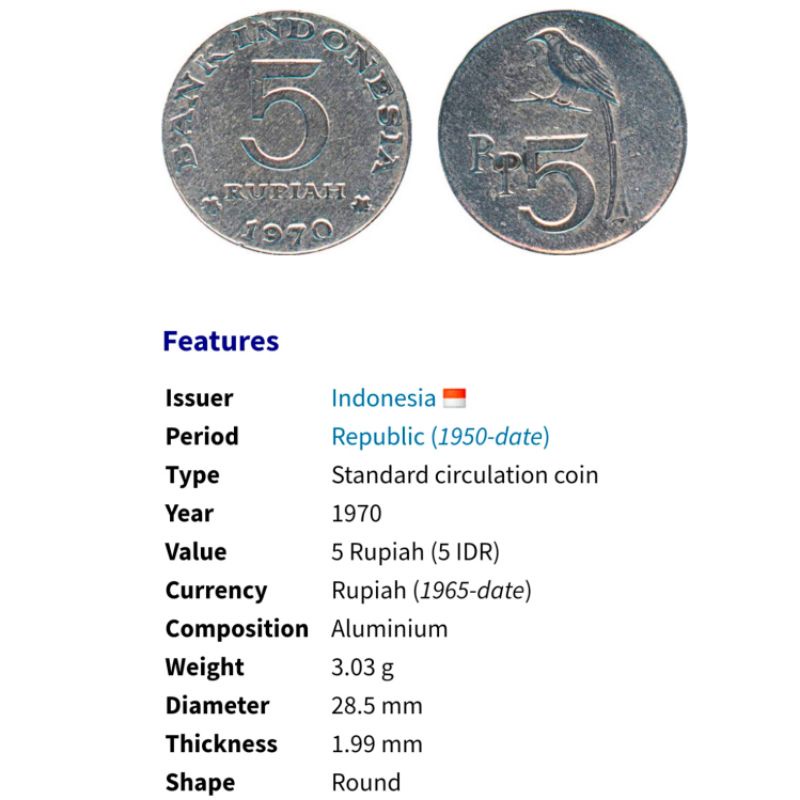 uang kuno koin 5 Rupiah Burung 1970