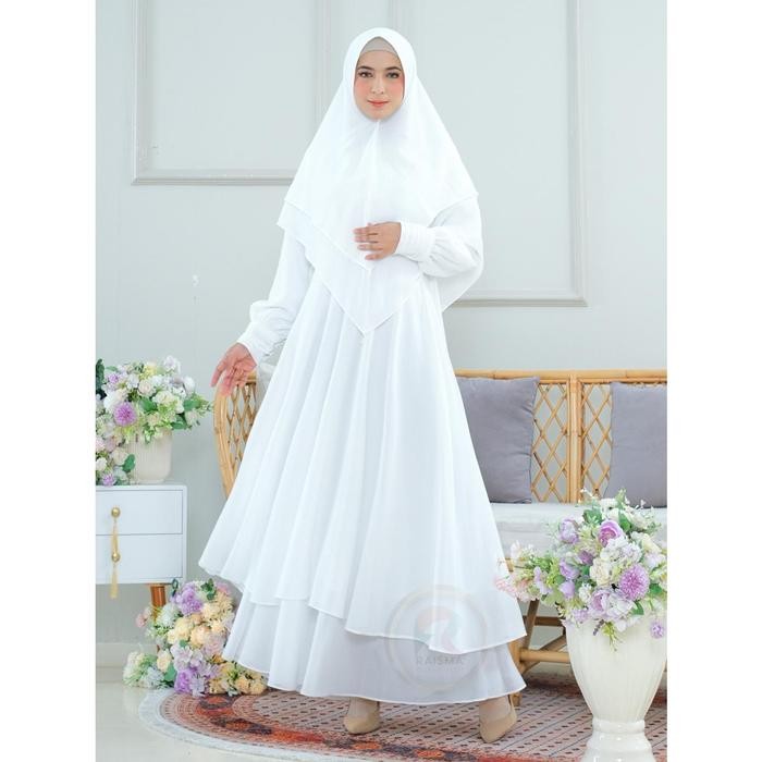 Raisma - Mafaza Gamis Putih Syari Set Khimar Bahan Ceruti Babydoll Baju Umroh Haji Muslim Wanita