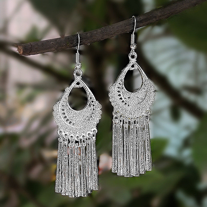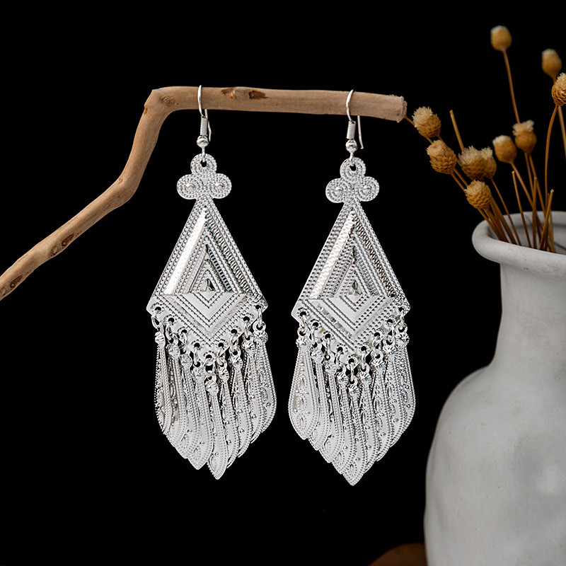 Anting perak Miao imitasi, anting gaya minoritas, anting objek wisata, anting berumbai daun panjang.