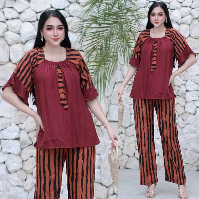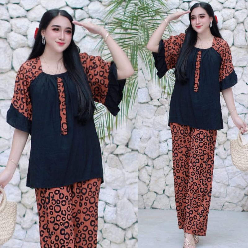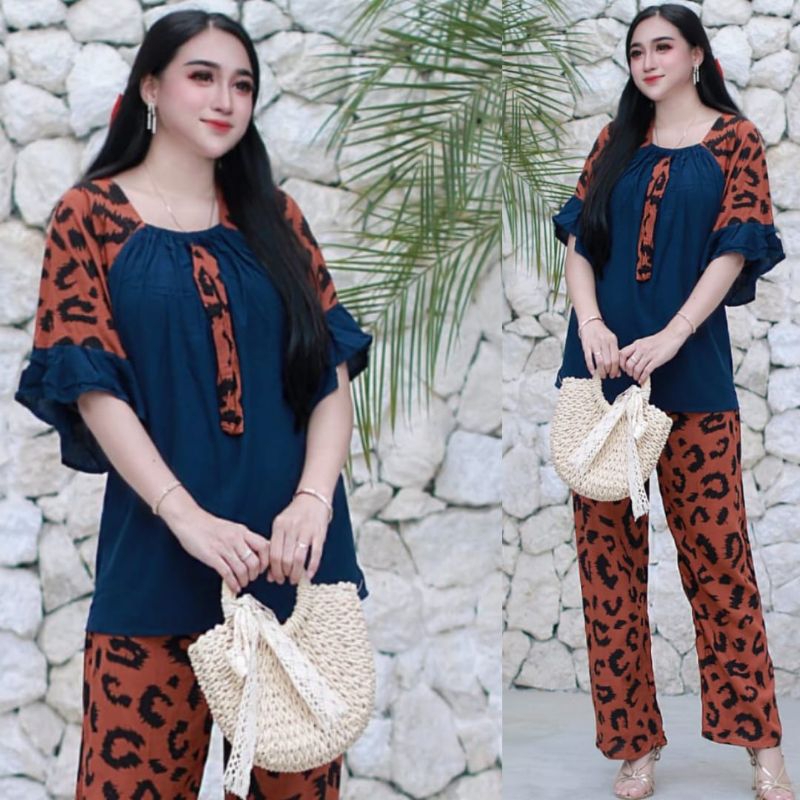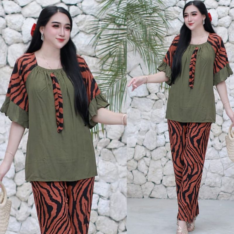 SETCEL WANITA DEWASA DAN REMAJA MOTIF MACAN KOMBINASI POLOS LENGAN TEROMPET REMPEL KEKINIAN