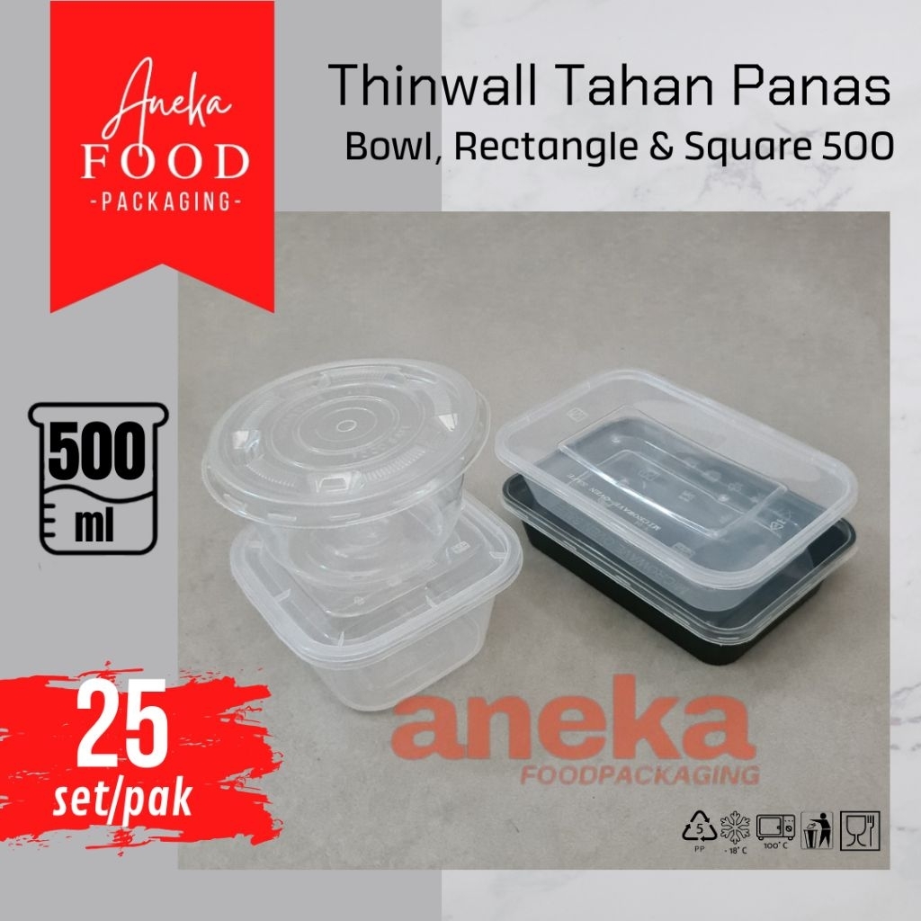 25set- Thinwall 500ml RECTANGLE, BOWL & SQUARE REC 500 SQ wadah plastik food container makanan mangkok kotak persegi bento dessert tahan panas microwave bening