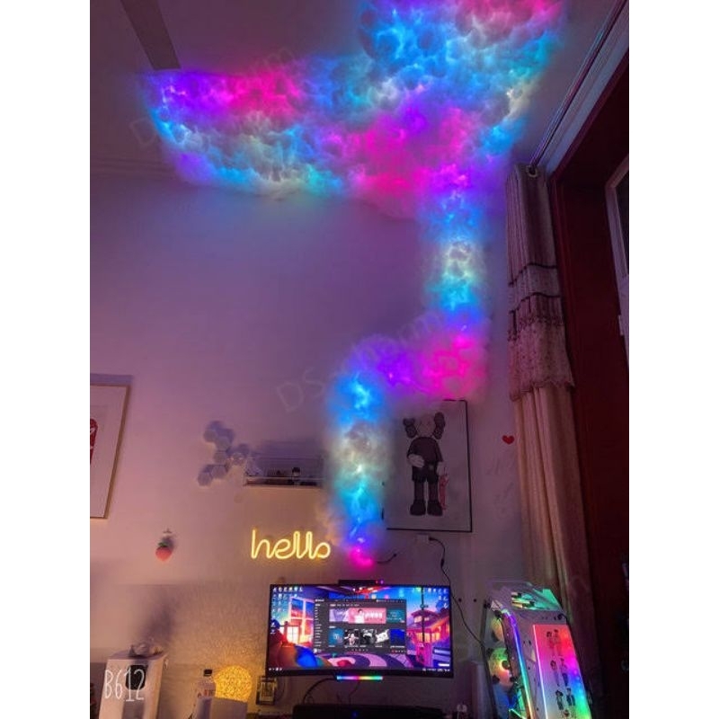 Hiasan dinding lampu awan dakron efek petir fullset LED running aesthetic sensor suara dan remot