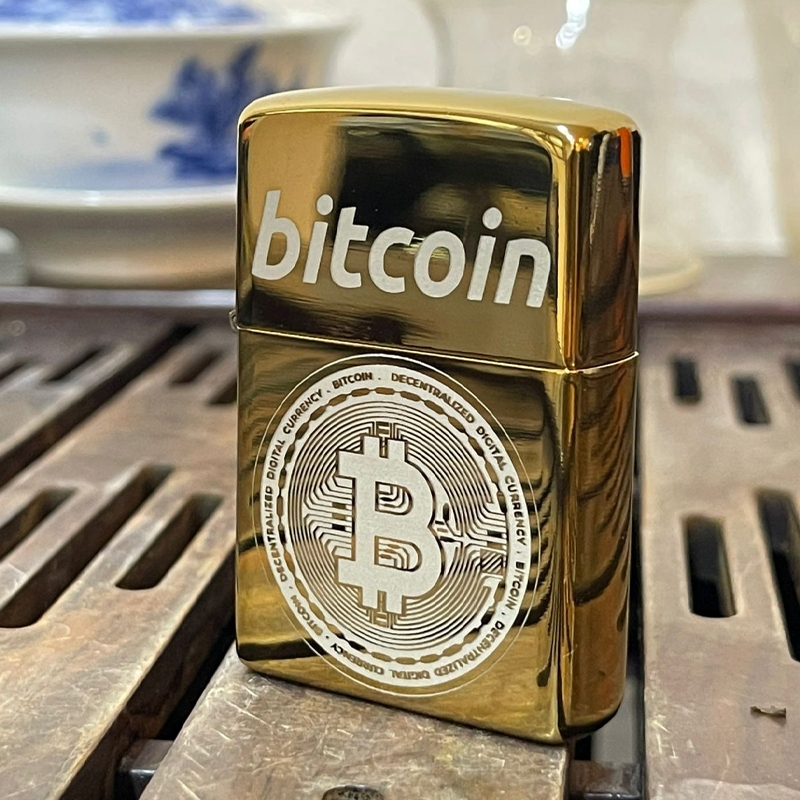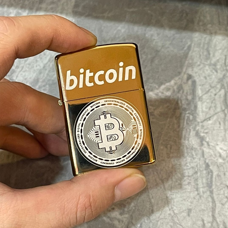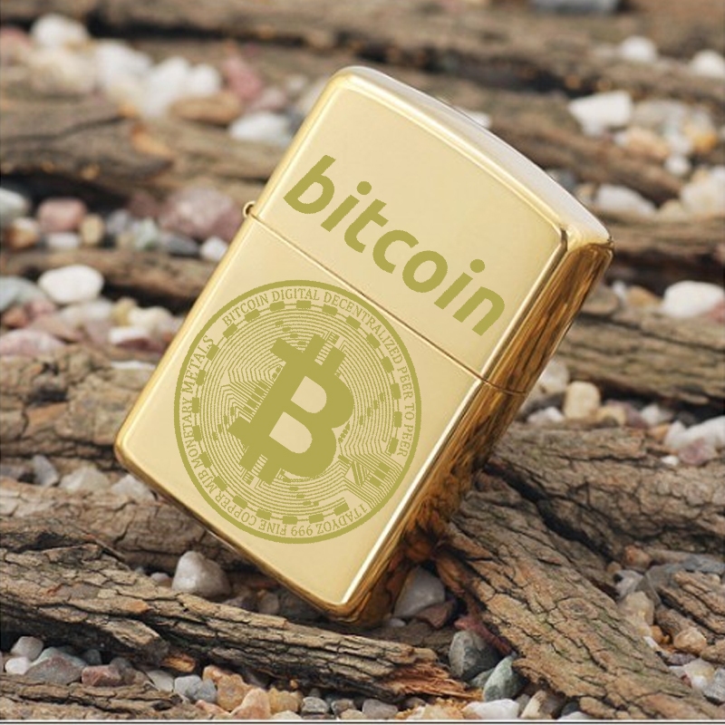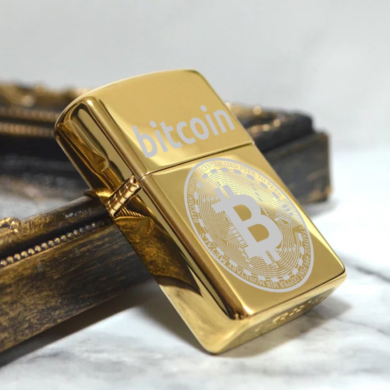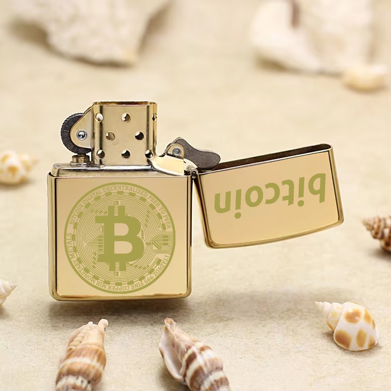 Korek Api Bitcoin Gold Emas Motif Crypto Stainless Cetak Laser Grafir Pemantik Rokok Bahan Metal