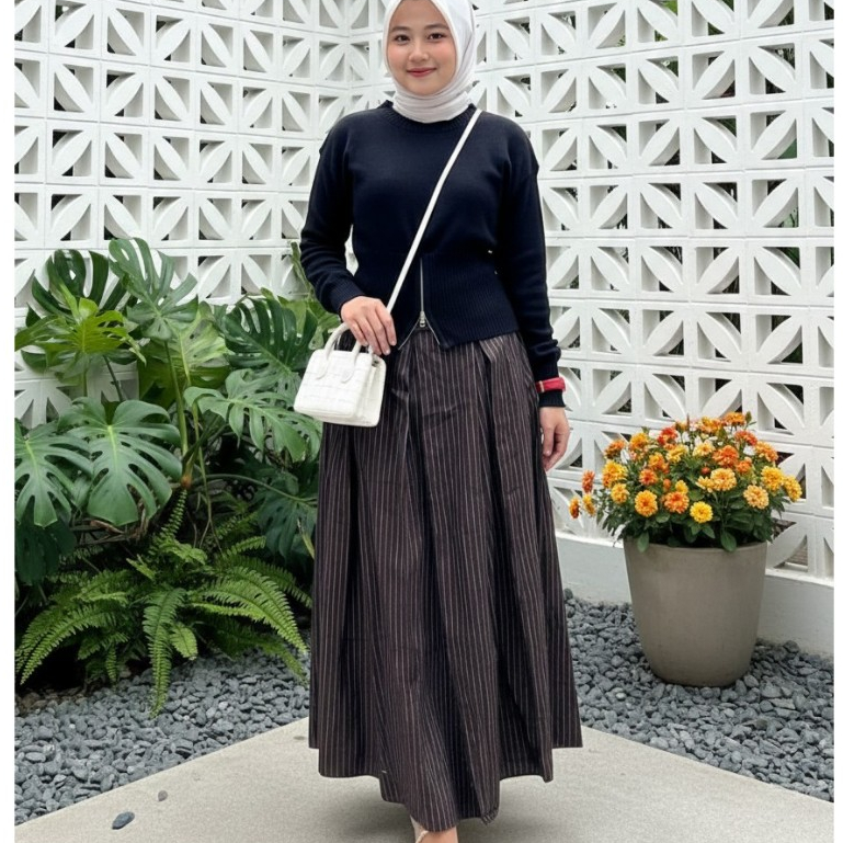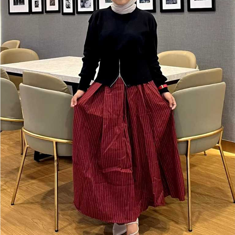Rok Stripe Wanita Korean Style Semiwoll Elastis