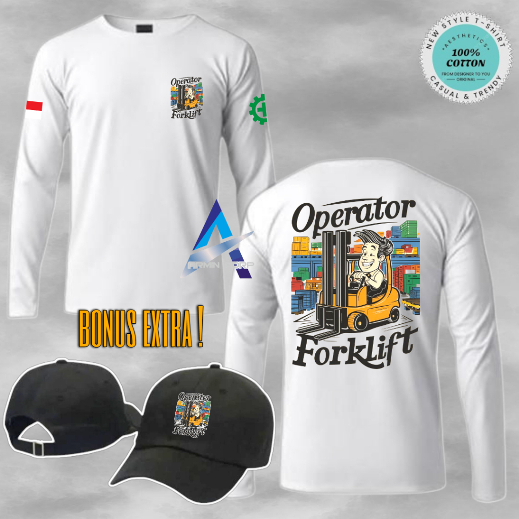 TSHIRT PROFESI OPERATOR FORKLIFT KARTUN TEMA SAFETY FIRST CASUAL TRENDY SIMPEL BONUS TOPI HITAM