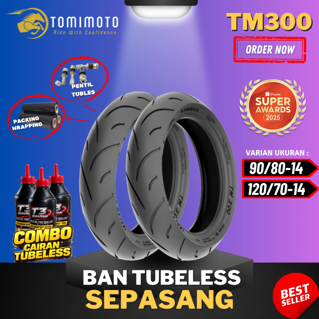 [SEPASANG MURAH] BAN TOMIMOTO TM300 RING 14 / ( 90/80-14 & 120/70-14 ) BAN TOMIMOTO TUBELESS TUBLES RING 14 / BAN TOMIMOTO TUBLES TM300 RING 14 / BAN MOTOR MATIC VARIO AEROX ADV PCX