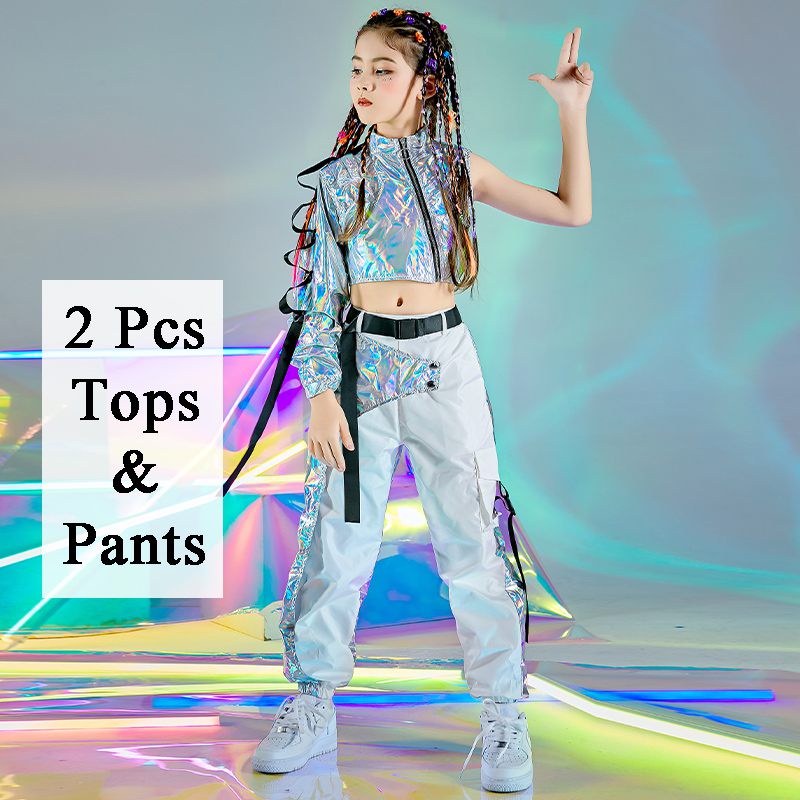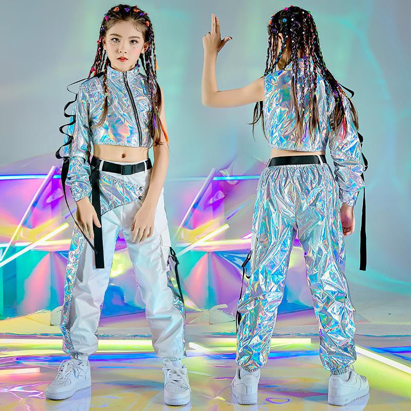 Hip-Hop Dance Clothes Reflective Rave Outfit Girl Sets Jazz Dancewear Festival Crop Tops Cargo Pants