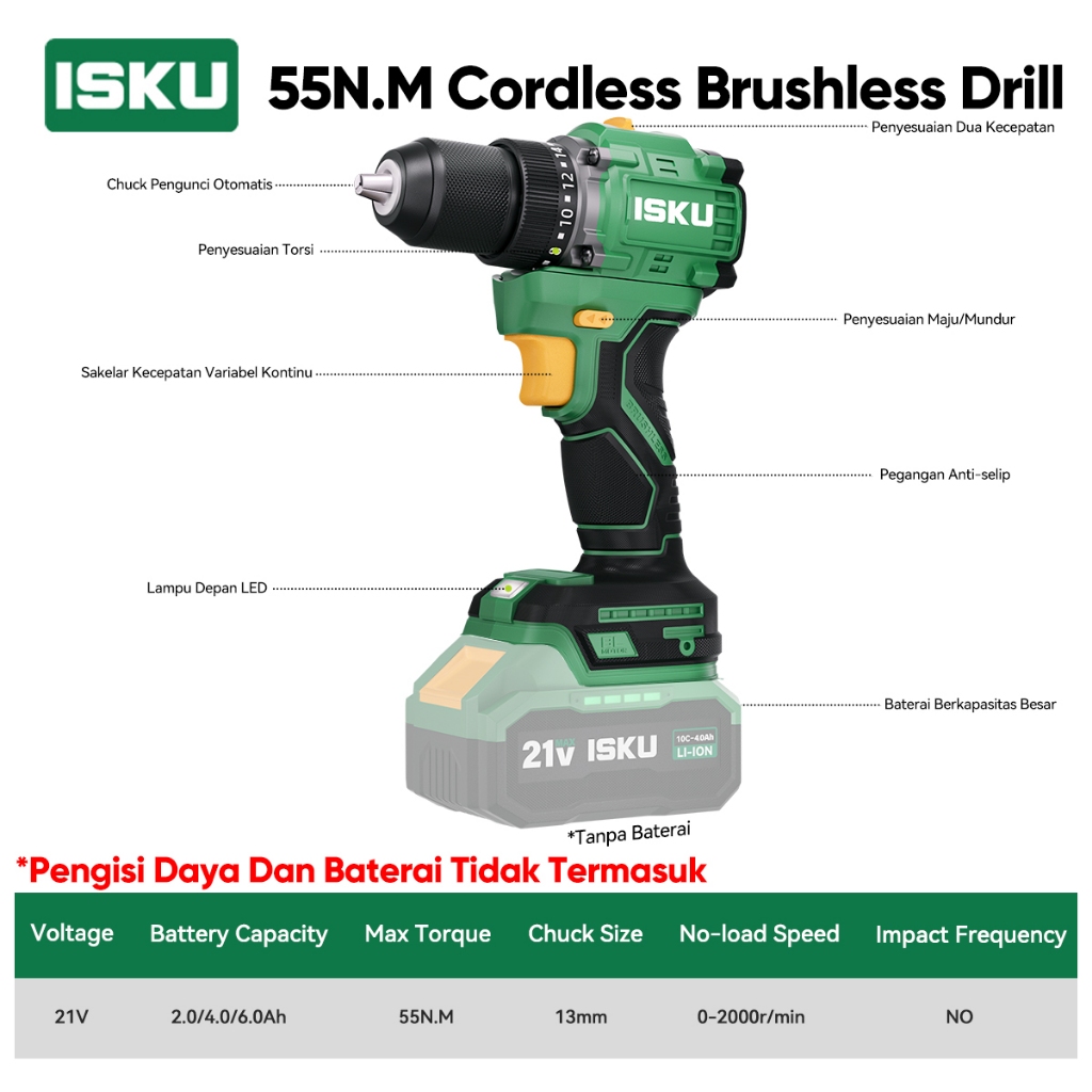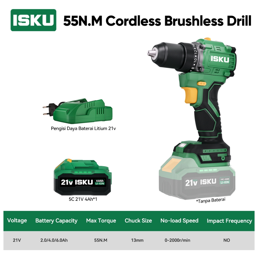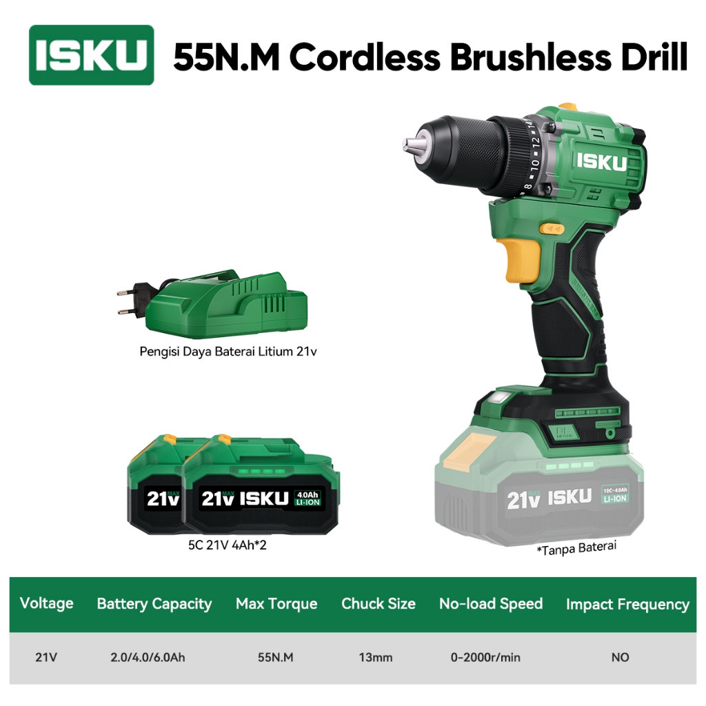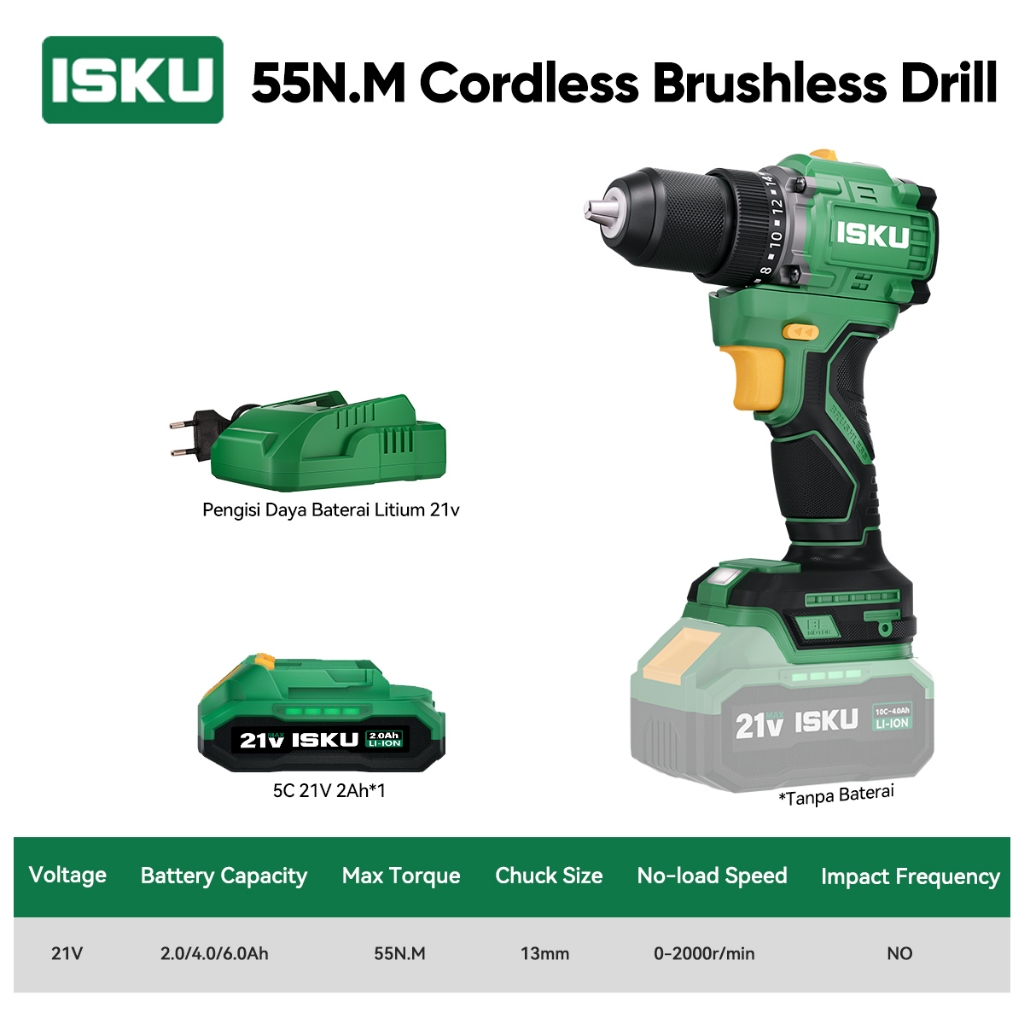 ISKU Brushless Cordless Drill 21V Heavy Duty 55Nm / 40Nm Mesin Bor Listrik Tanpa Kabel Alat Tukang Pasang Plafon Roofing Baut Kayu Besi Motor Tembaga Murni High Power Variable Speed